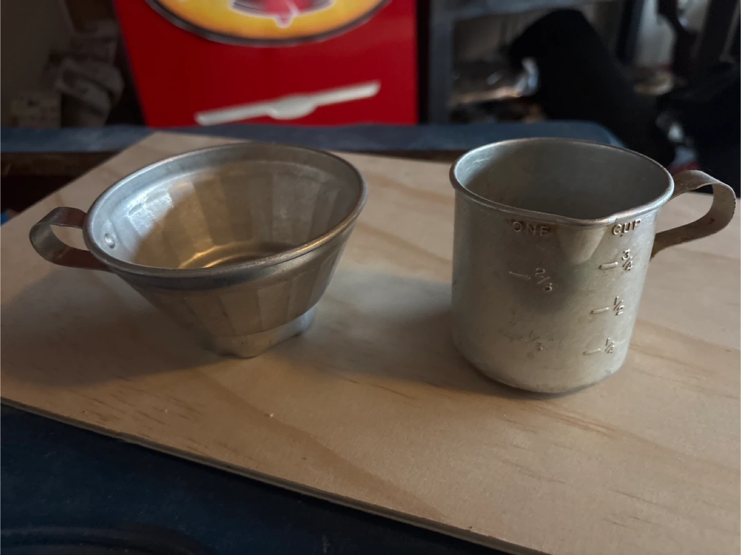 Selling a vintage aluminum measuring cup and funnel set. The measuring cup is marked with measurements up to one cup. Both pieces have a classic, rustic look!