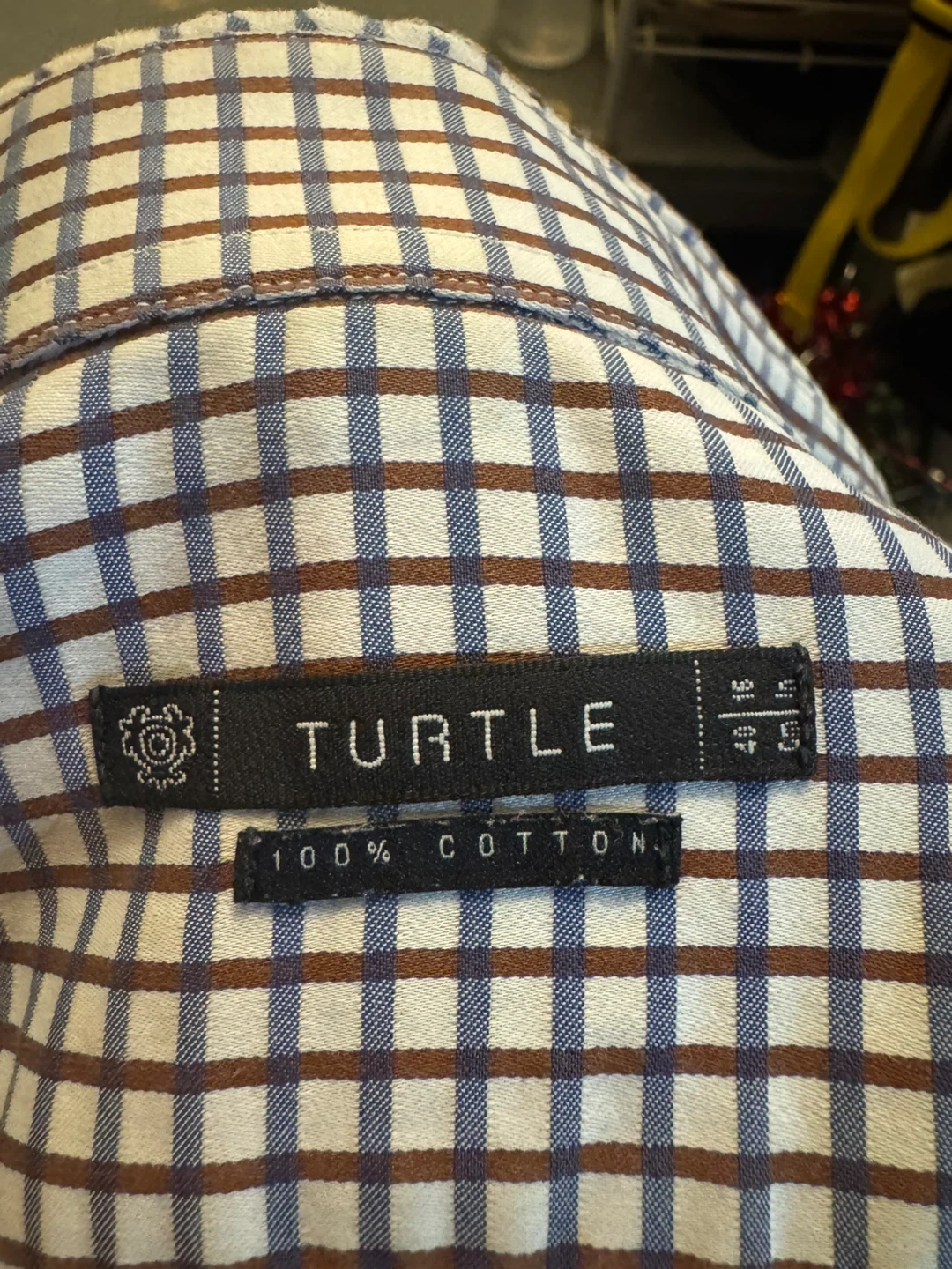 Here's a Turtle brand shirt made of 100% cotton! It features a checkered pattern and would be a great addition to your wardrobe. It's in good condition and ready for a new home