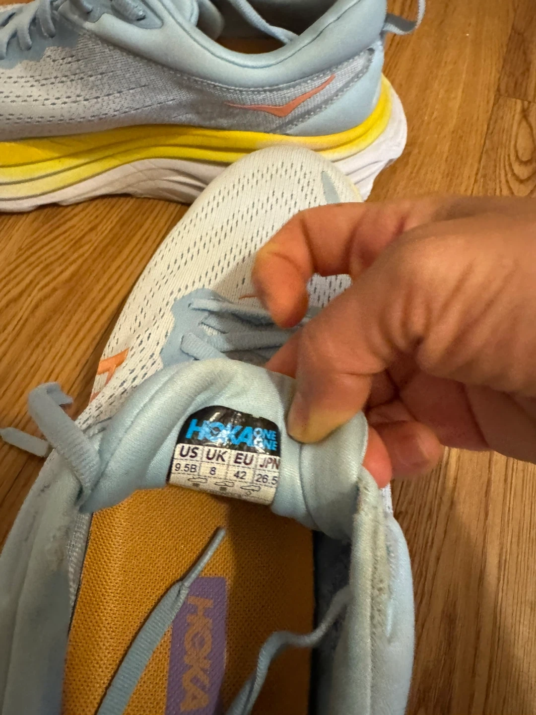 Selling a pair of Hoka One One running shoes in US size 9.5. These shoes are in good condition and ready for your next run! They feature a light blue and yellow design. Perfect for anyone looking for comfortable and supportive running shoes