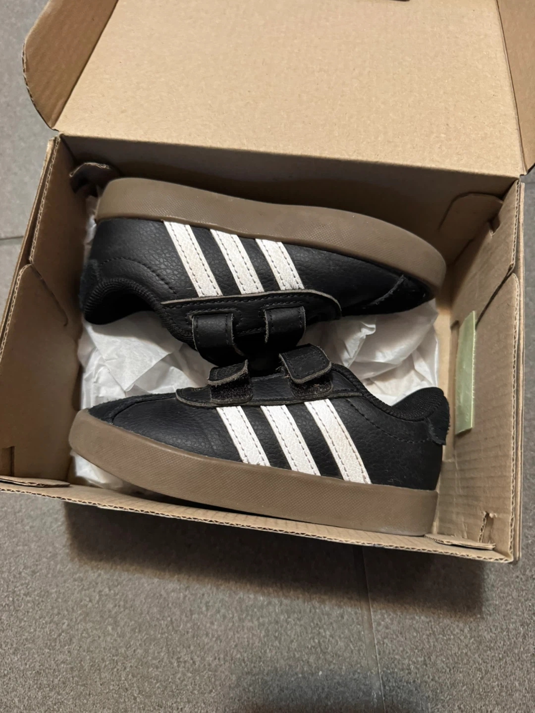 Selling a pair of Adidas VL Court 3.0 CF I sneakers for kids! They are black with the classic white Adidas stripes and have a velcro closure. The size is 6K (US). They come with the original box