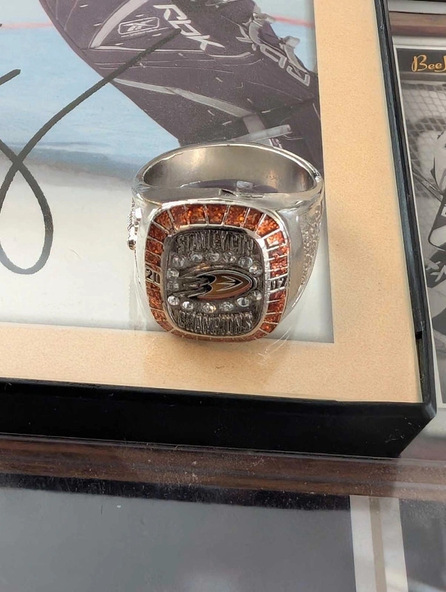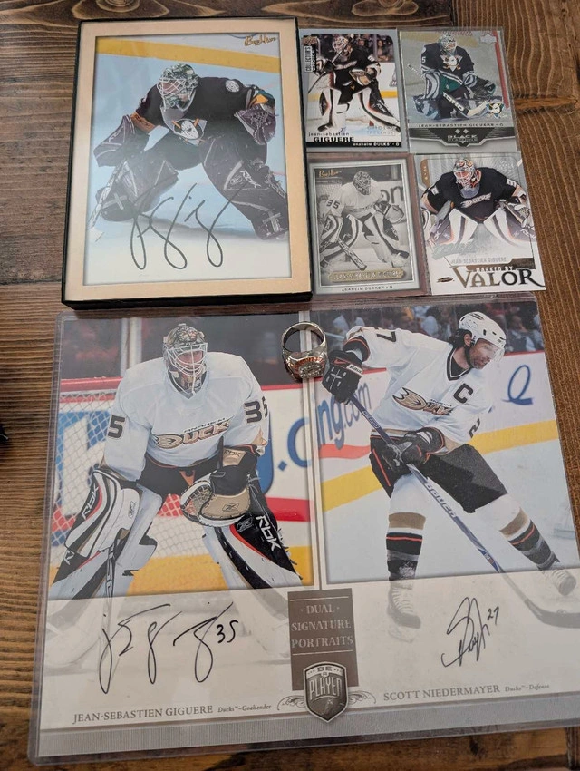Own a piece of hockey history with this used Anaheim Ducks memorabilia collection! It includes a framed and signed Jean-Sebastien Giguere photo, several Giguere hockey cards, a dual-signed portrait card featuring Giguere and Scott Niedermayer, and a replica Molson Canadian championship ring. All items are in good condition and ready to be displayed. If the ad is up, the memorabilia is available!