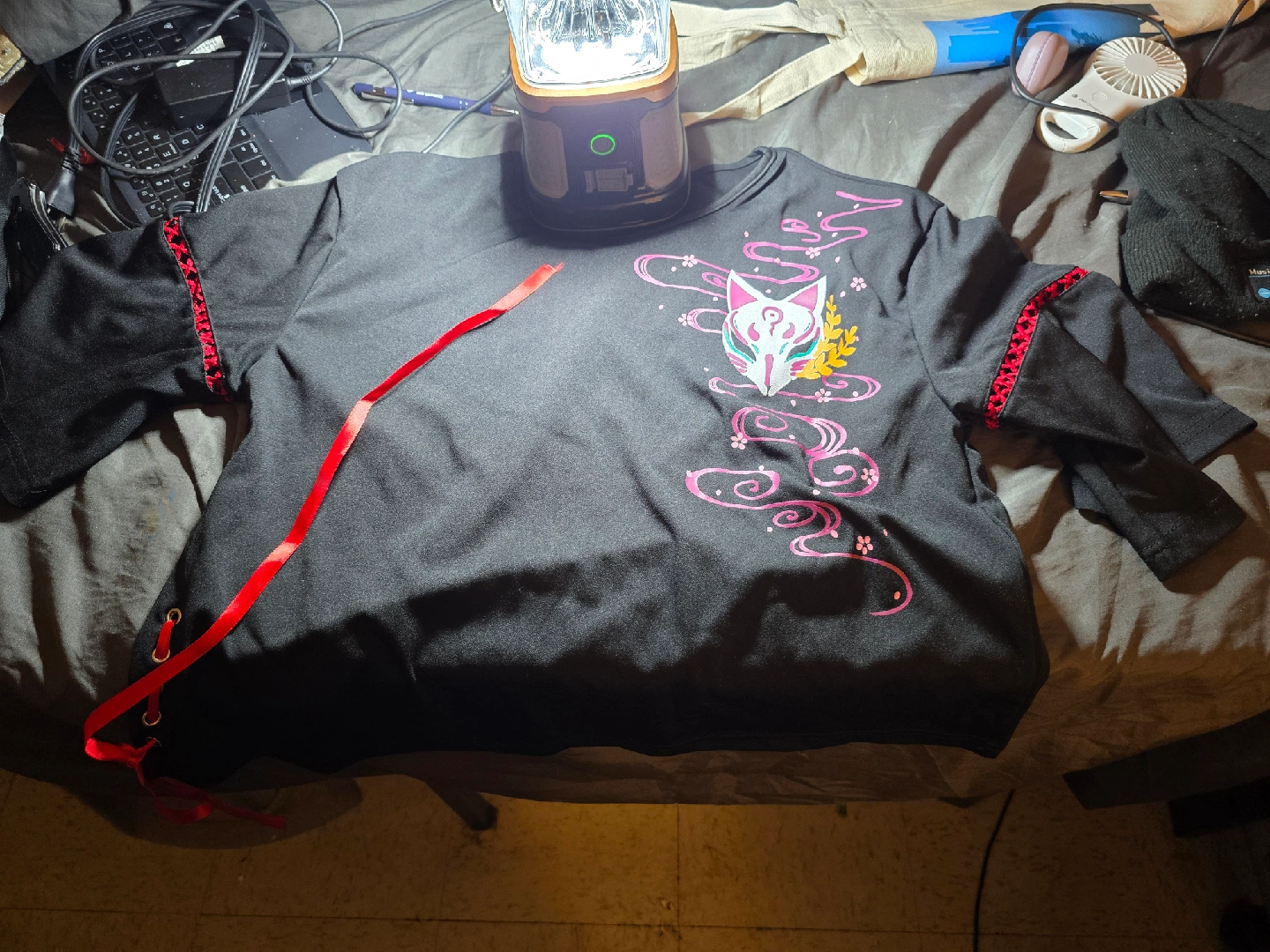 15Cute black top with an anime style design. It has a red ribbon detail and some red accents around the sleeves. It's in great condition!