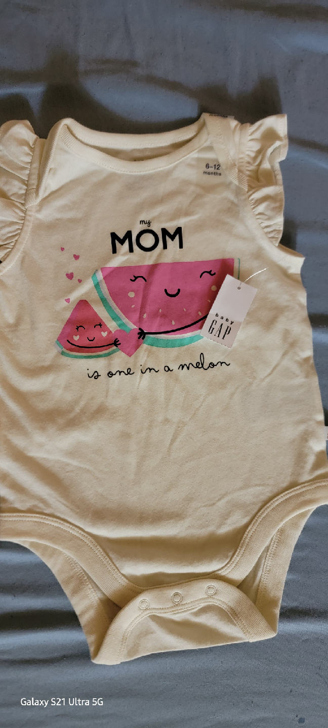 This is a Baby Gap onesie, perfect for a little one aged 6-12 months! It has a cute design with watermelons and the phrase "my MOM is one in a melon"!