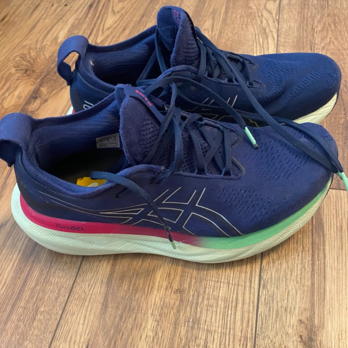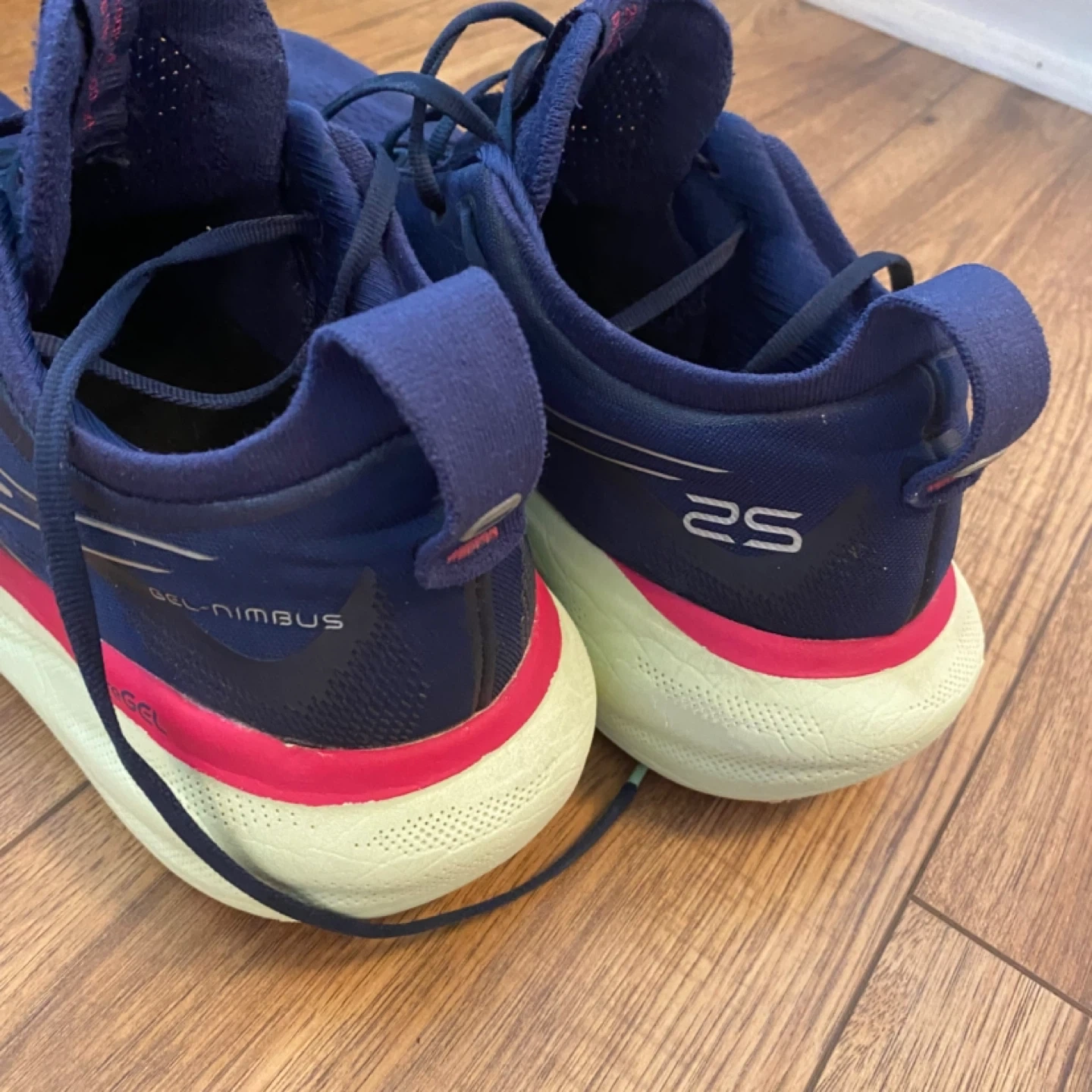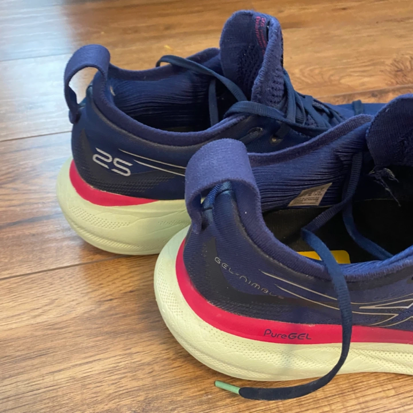 Selling a pair of Asics Gel-Nimbus 25 running shoes in a nice blue colour. They are a US size 9.5. The shoes feature PureGel technology for a comfortable run!