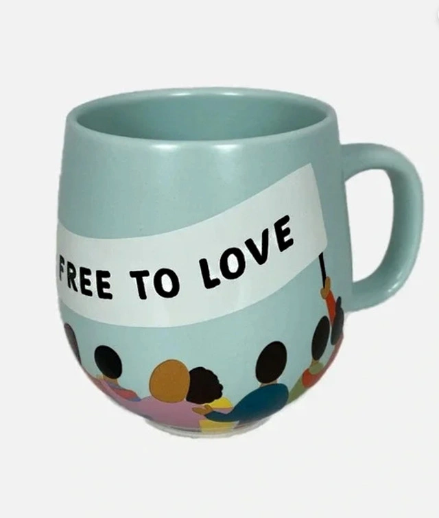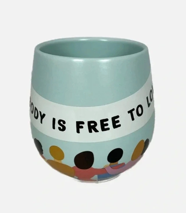 Light green Indigo Mug “Everybody is Free to Love” Banner Coffee Tea Ceramic 14 oz. in like new condition. Selling price: $15