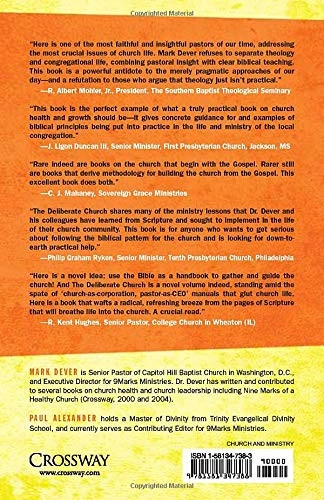 The Deliberate Church: Building Your Ministry on the Gospel by Mark Dever & Paul Alexander. Publisher: Crossway, 2005. Paperback, 224 pages. ISBN: 978-1581347388. Selling for $10. Condition: New. Cash and cashless payment accepted. For sale by owner. Curbside pick up available.