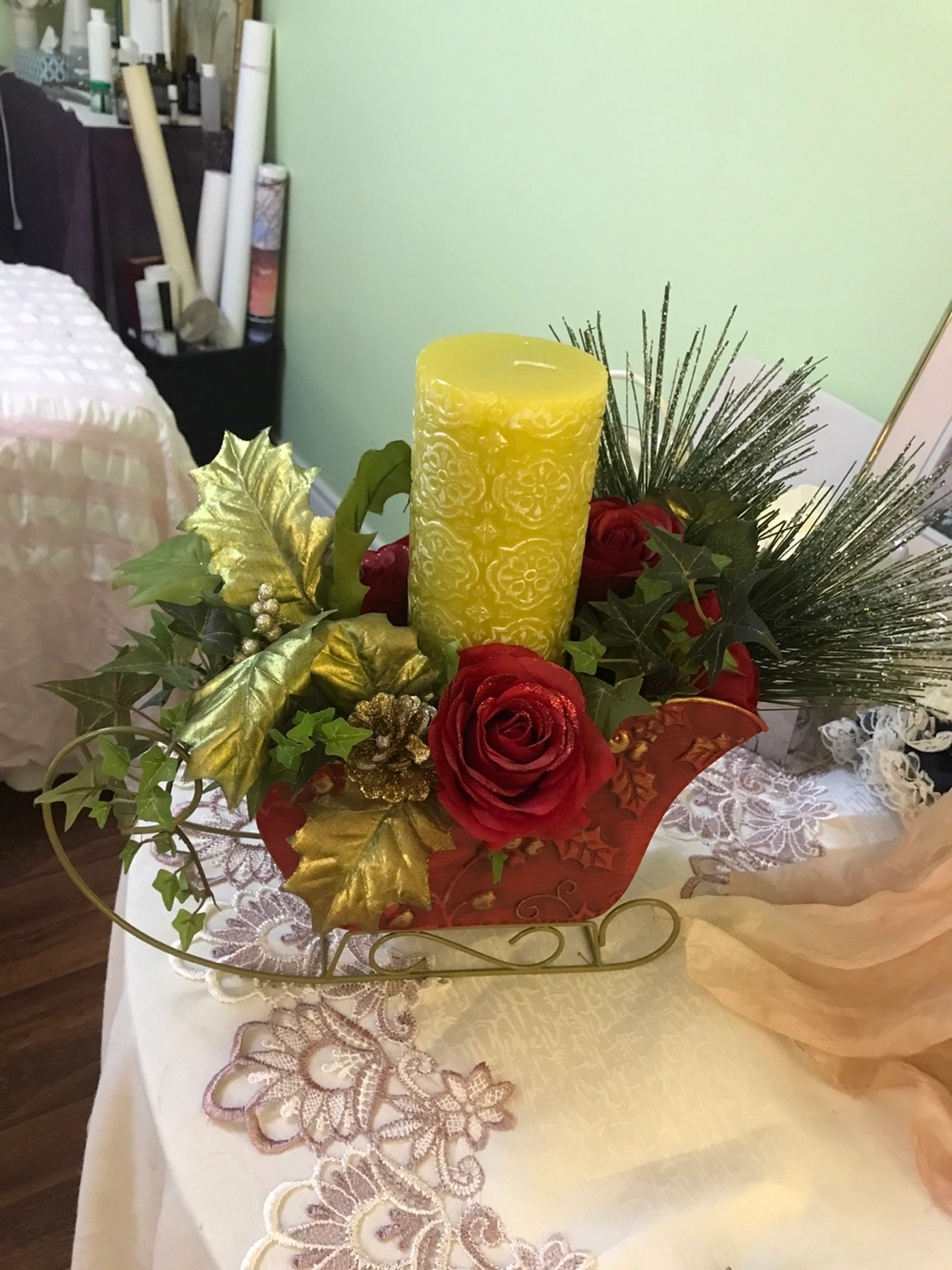 This is a lovely floral candle centerpiece, perfect for adding a touch of elegance to any room. It features a yellow candle surrounded by red roses and greenery, all arranged in a decorative sleigh-shaped container. It would make a beautiful addition to your home decor or a thoughtful gift!