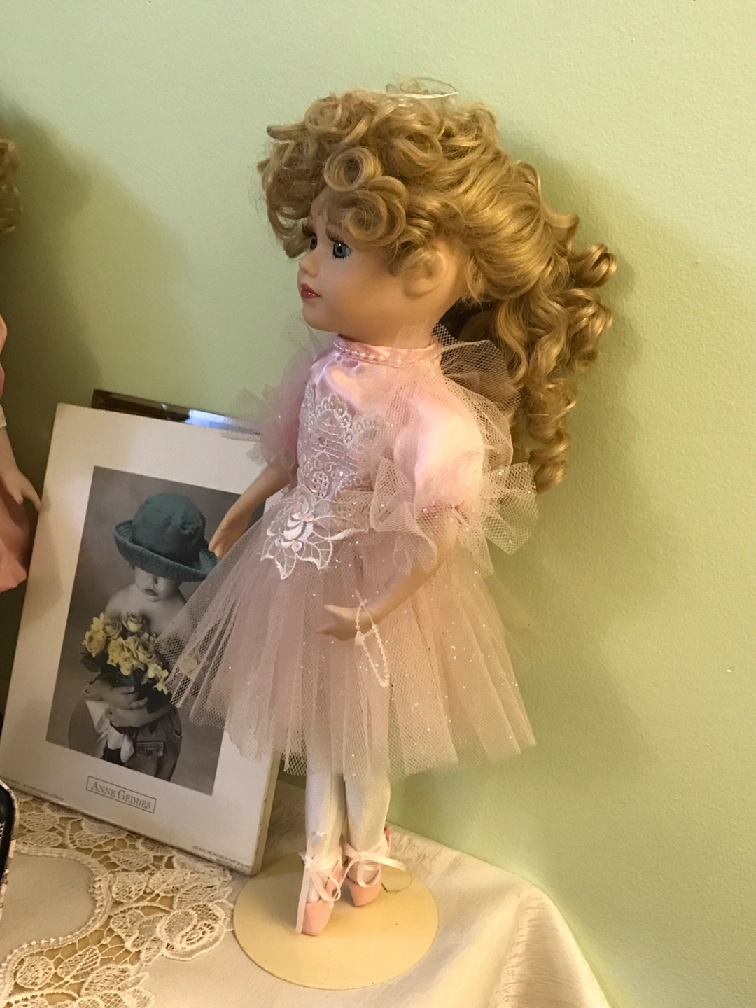 A beautiful porcelain doll dressed in a lovely pink dress. She has curly blonde hair and is standing on a stand. She would make a lovely addition to any doll collection