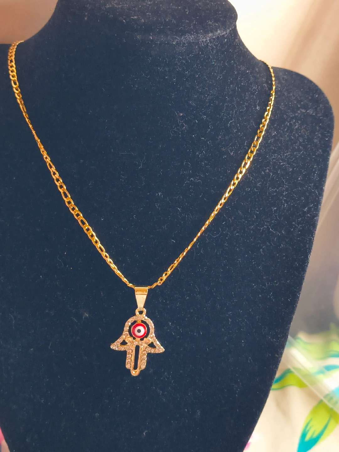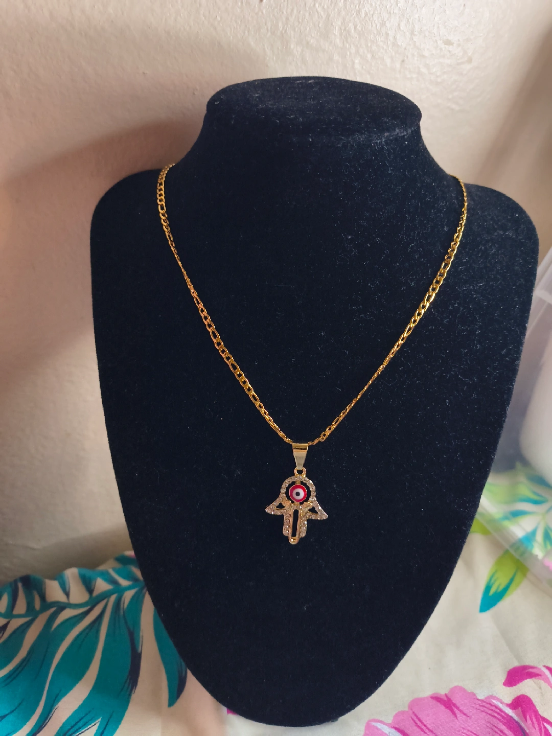 Selling a gold Hamsa hand necklace! It's in great condition and has a beautiful design. Perfect for adding a touch of style to any outfit