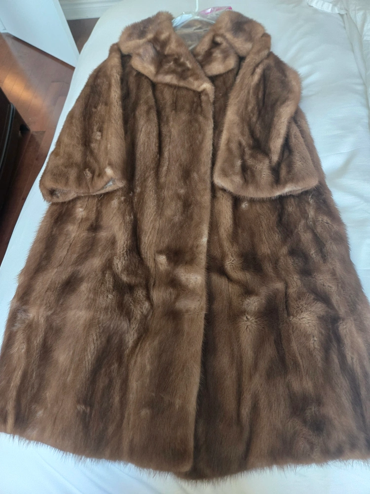 Selling a vintage brown mink fur hat and coat set. The coat is a full length coat. The hat is a smaller pillbox style. They are in good condition for their age!