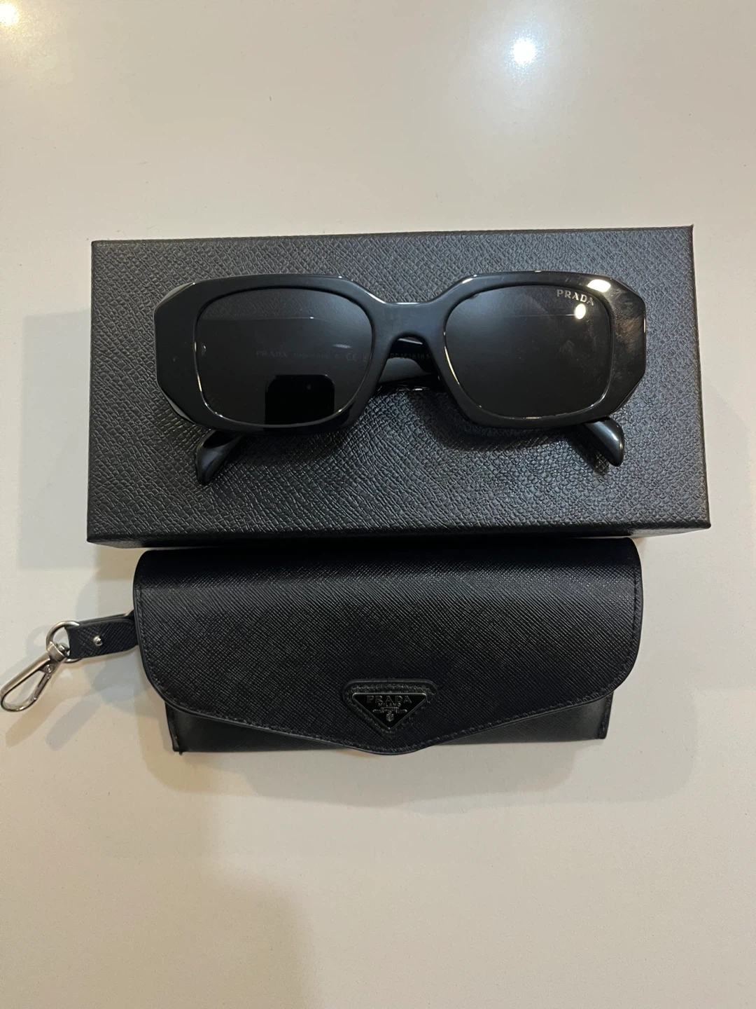 Selling a pair of Prada sunglasses in black. They come with their original box and a protective case. These sunglasses are in great condition and ready for a new owner!