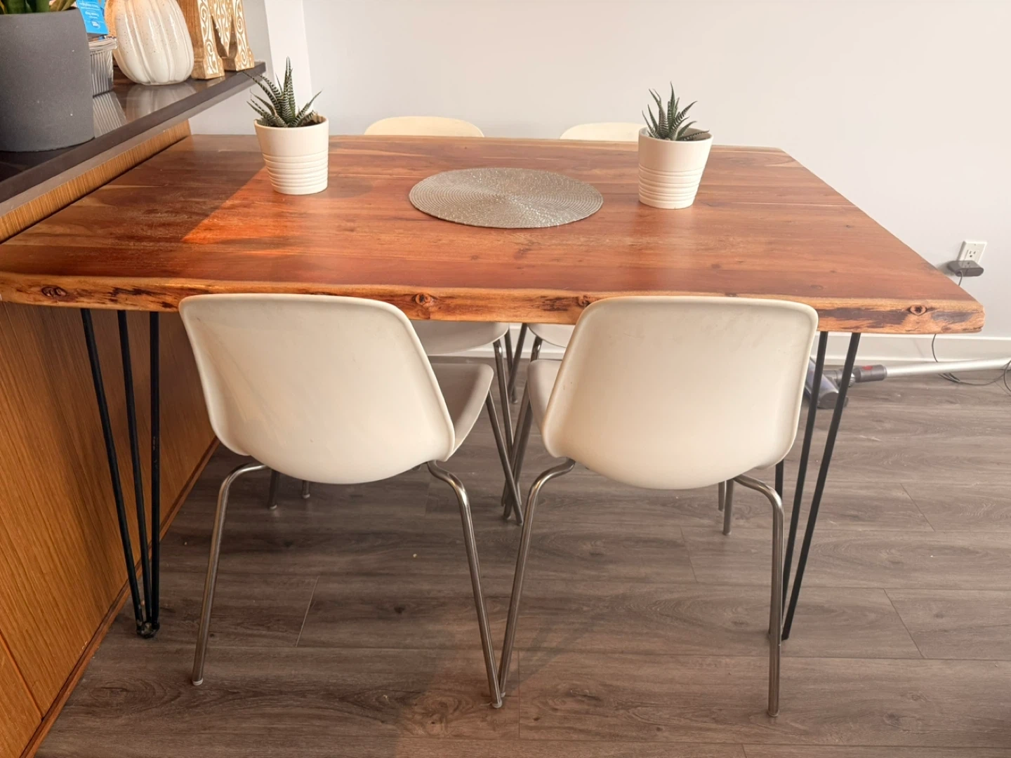 Selling a lovely wood dining table with four white chairs. The table has a unique, natural edge and sturdy metal legs. It's perfect for a kitchen or dining room! Great set for small spaces or apartments. Chairs not included