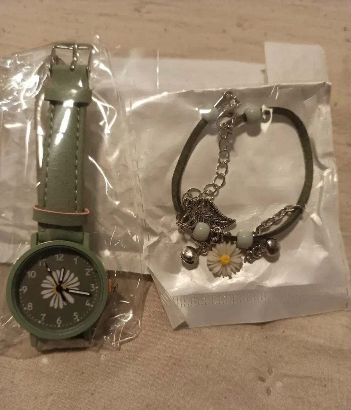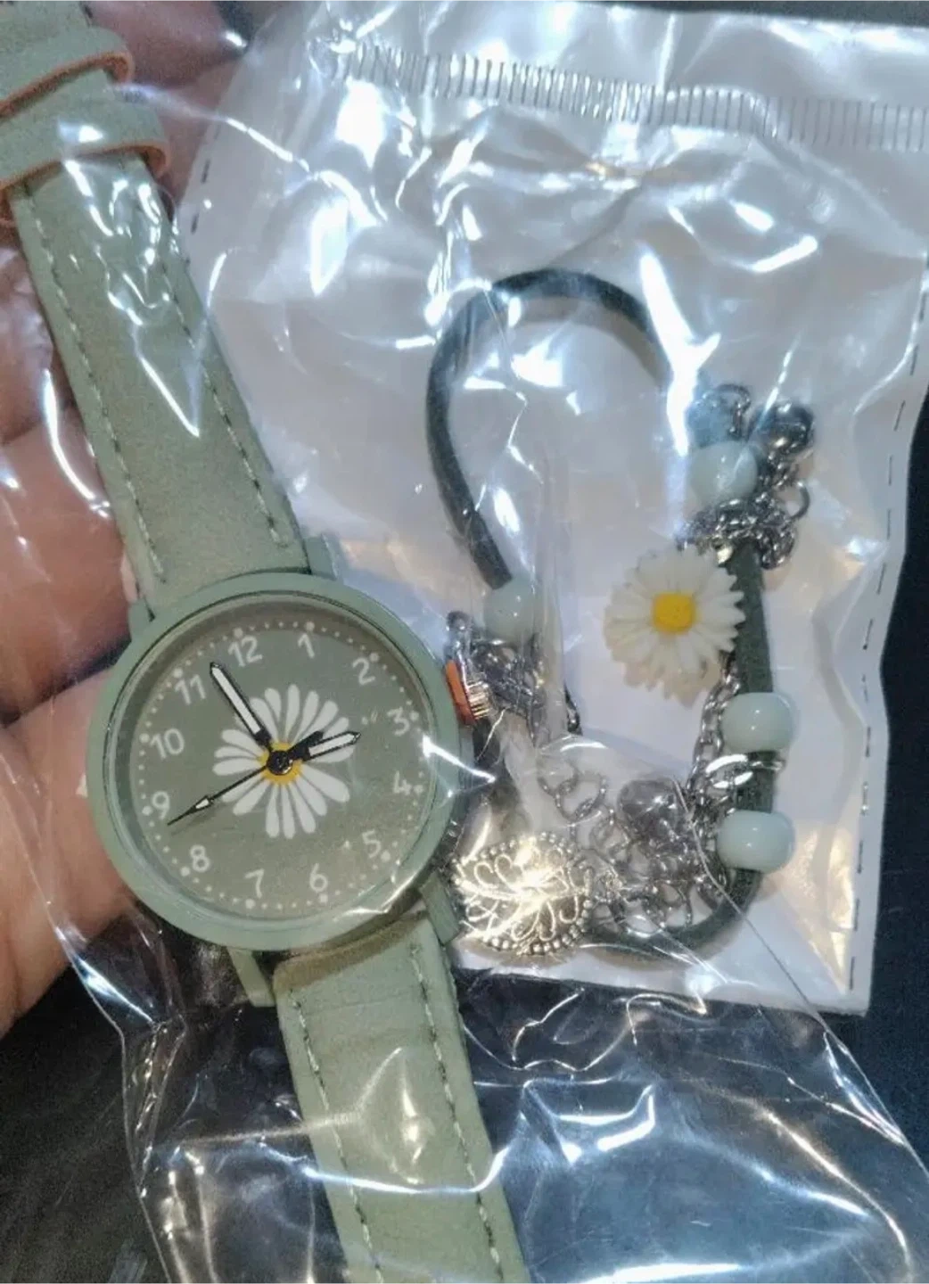 Selling a brand new, adorable green watch and bracelet set! The watch features a cute daisy design on the face, and the bracelet complements it perfectly. Both are still in their original packaging.