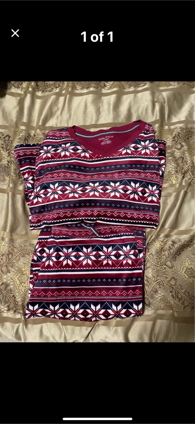 Cozy Nautica pajama set, perfect for those chilly nights! The set features a festive pattern in red, white, and navy. It's in great condition and ready for a new home.purses and ladies under wear
