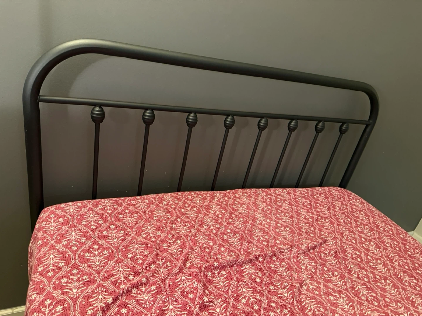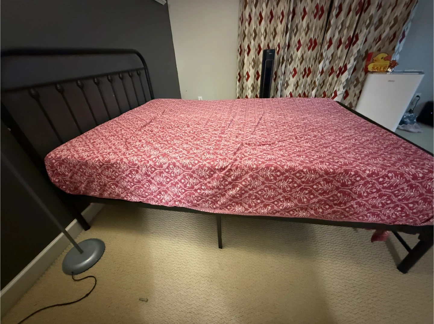 Selling a black metal bed frame! It's in great condition and ready for a new home. The frame has a sleek and simple design that would suit any bedroom decor. The mattress is also very comfortable.