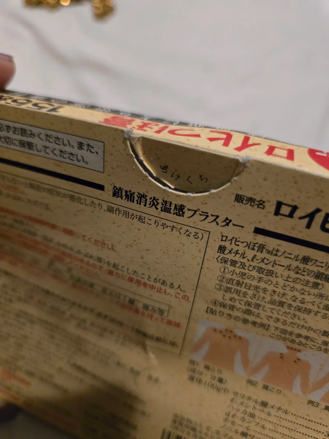 Just arrived. a slightly bent box of Salonpas like patches. Tried this and it works . It stays longer on skin if not soaked in bathing.the box cracked open but never pulled out items. You can check it if you want to see what's inside no pressure so that you'l see what you're buying.