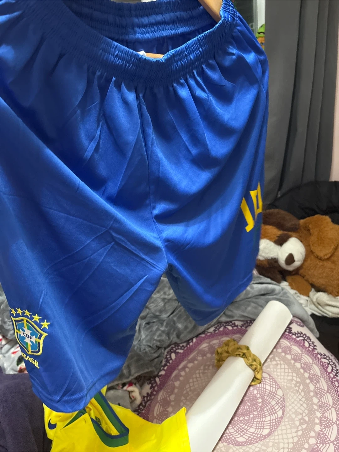 Selling a Brazil Neymar Jr. soccer jersey and shorts set from Nike. The set is in excellent condition and features the iconic yellow and blue colours. The jersey has 'NEYMAR JR. 10' on the back, and both items are size G (Large). Perfect for any soccer fan!