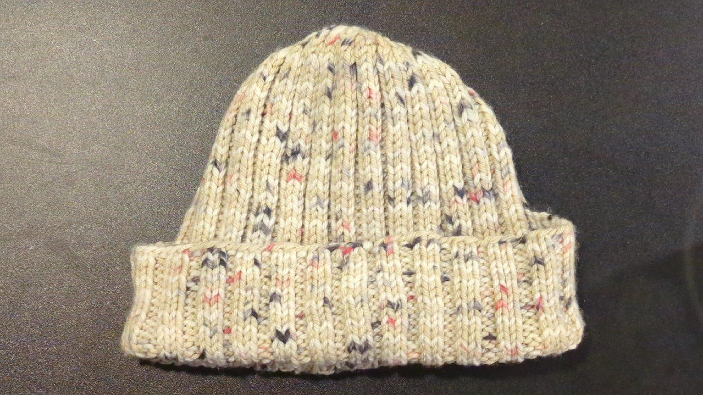 Keep your head cozy with this knitted beanie! The neutral colour with flecks of colour will match almost anything.