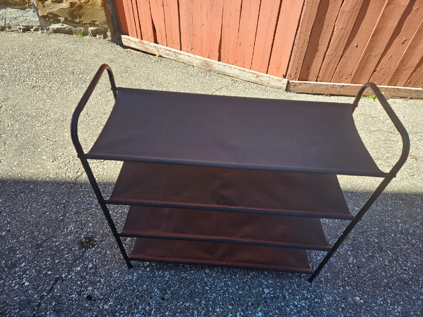 38Here's a handy brown 3-tier shoe rack to keep your entryway neat and tidy! It measures approximately 34 inches in length and is in great condition. Perfect for organizing your shoes or using as a small storage shelf