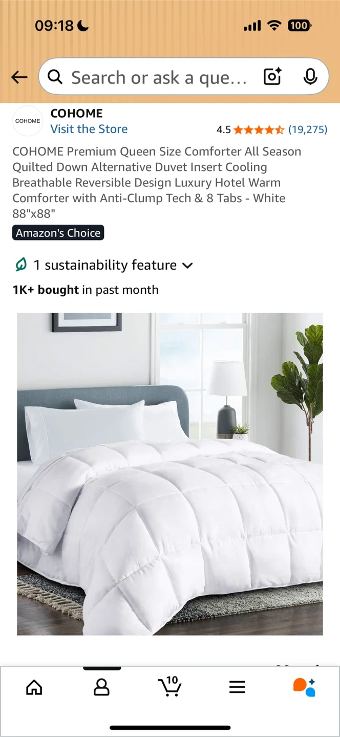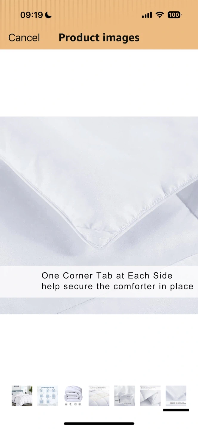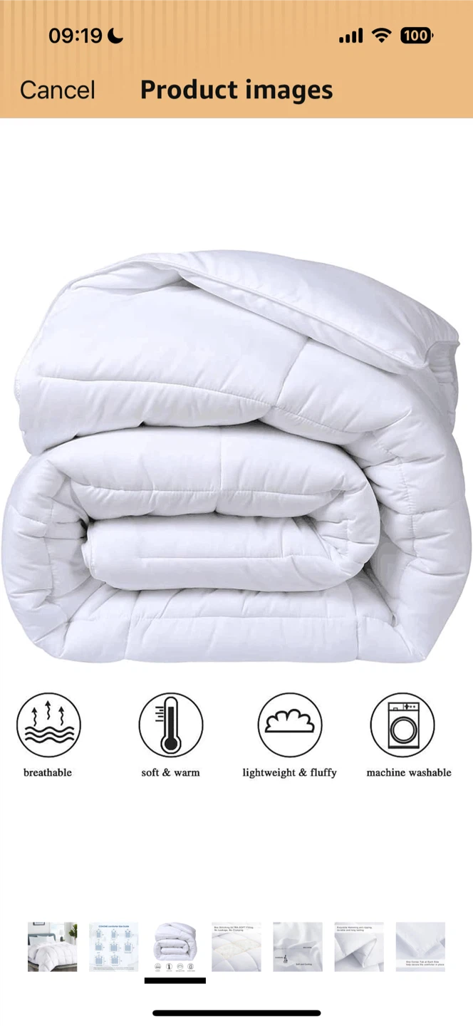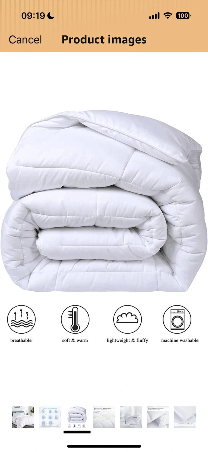 This is a COHOME Premium Queen Size Comforter in white. It's all-season, quilted, and has a cooling breathable design. It also features anti-clump tech and 8 tabs. It's lightweight and fluffy, soft and warm, and machine washable