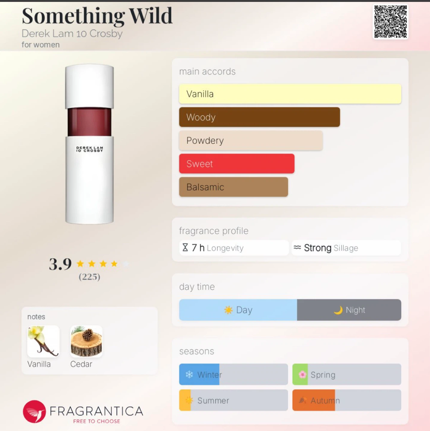 Selling a Derek Lam 10 Crosby Something Wild Eau de Parfum. It comes in a 50mL - 1.7 fl.oz size and has vanilla and cedar notes. The main accords are vanilla, woody, powdery, sweet, and balsamic. It's perfect for day or night, and suitable for any season