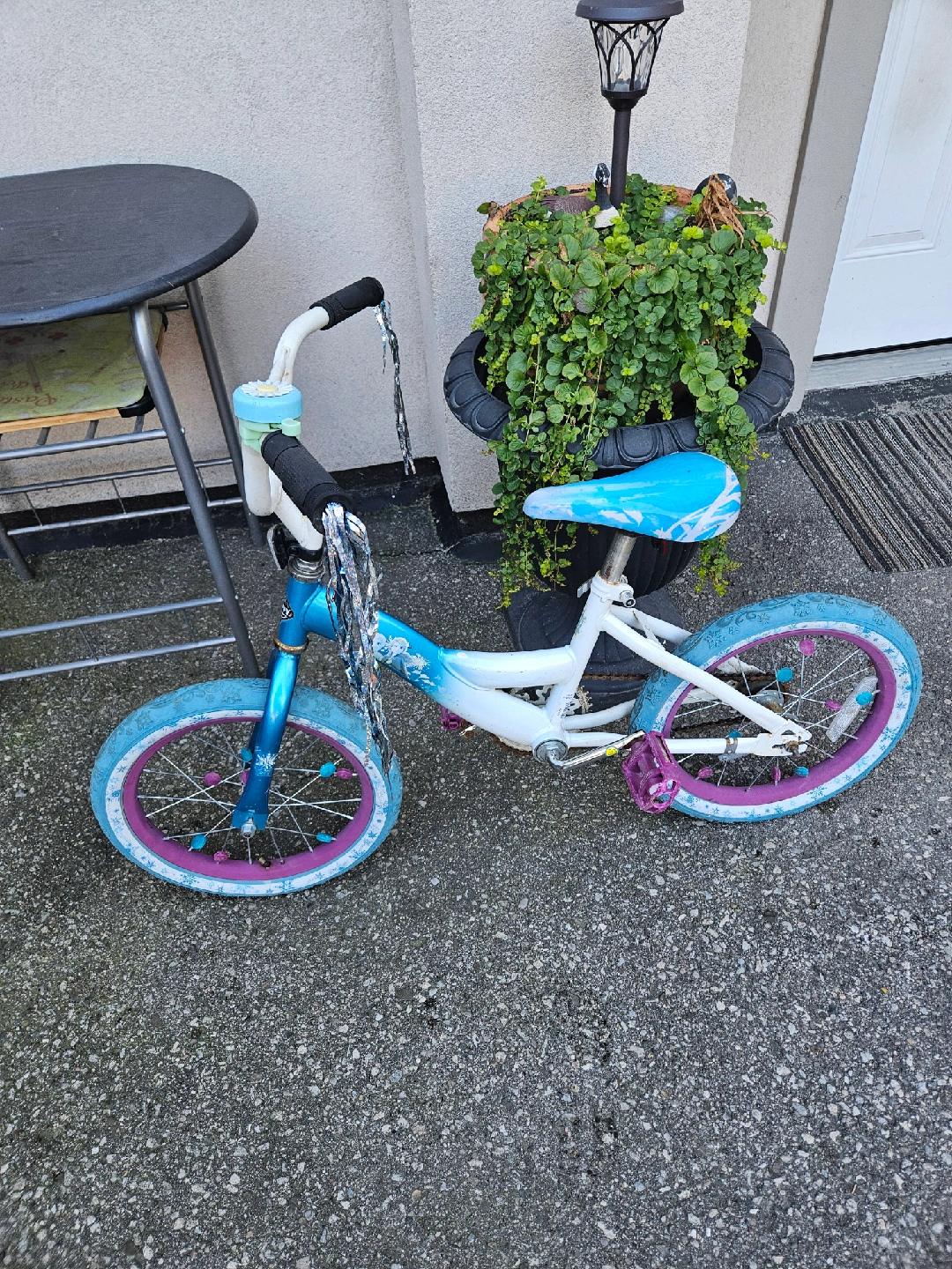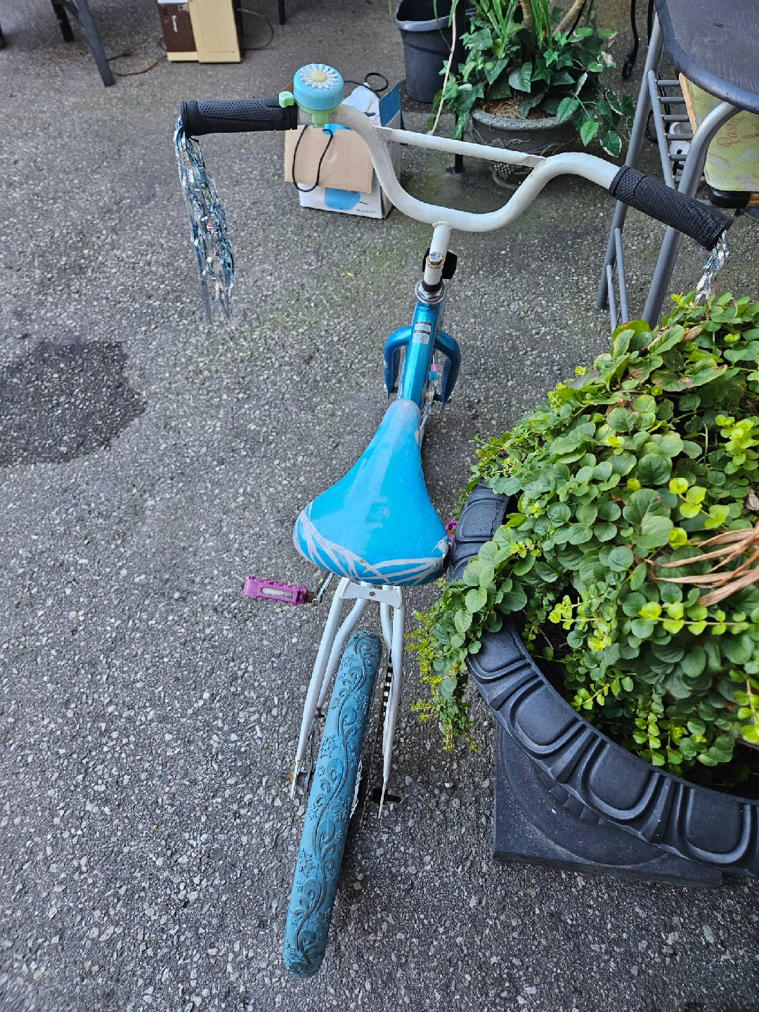Selling a cute kids' bike in blue and white. It's in good condition and ready for a new rider