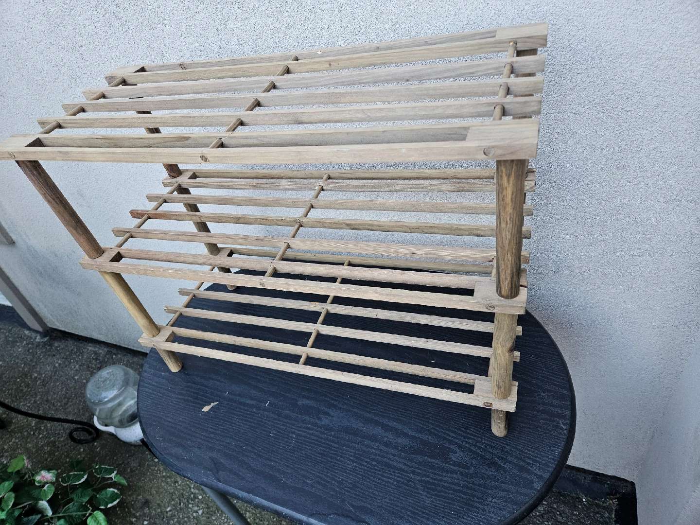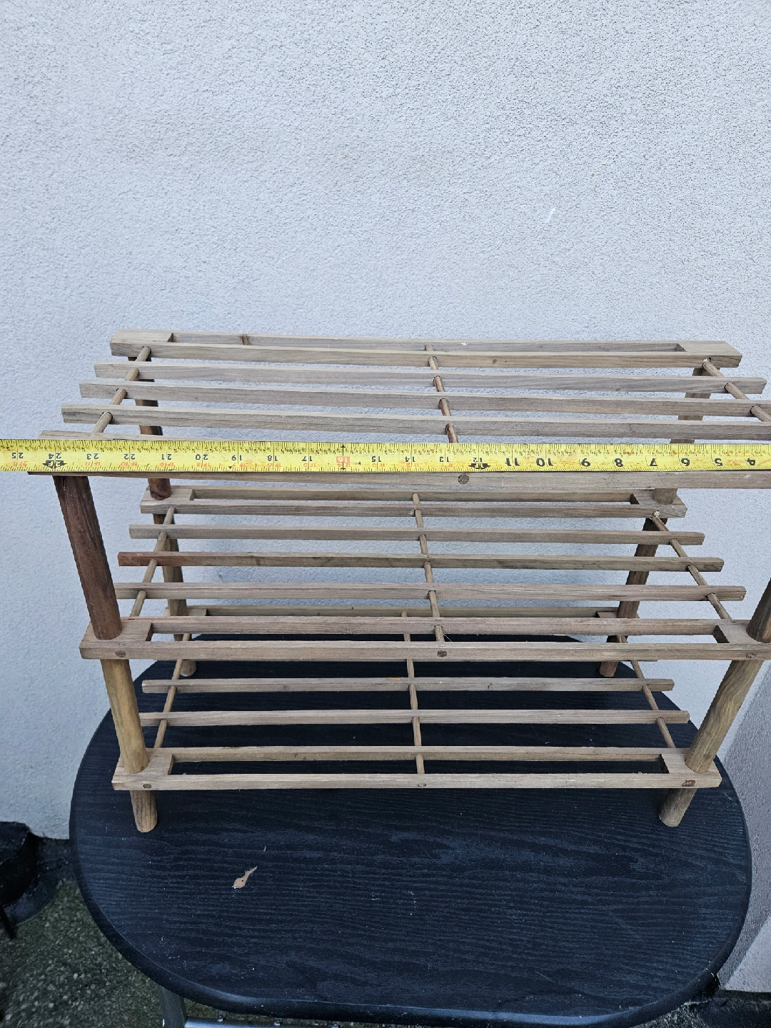 38Here's a wooden shoe rack that's perfect for keeping your entryway tidy. It's a simple, natural design that fits in with most decor. I've measured it to be about 25 inches wide and 19.5 inches tall