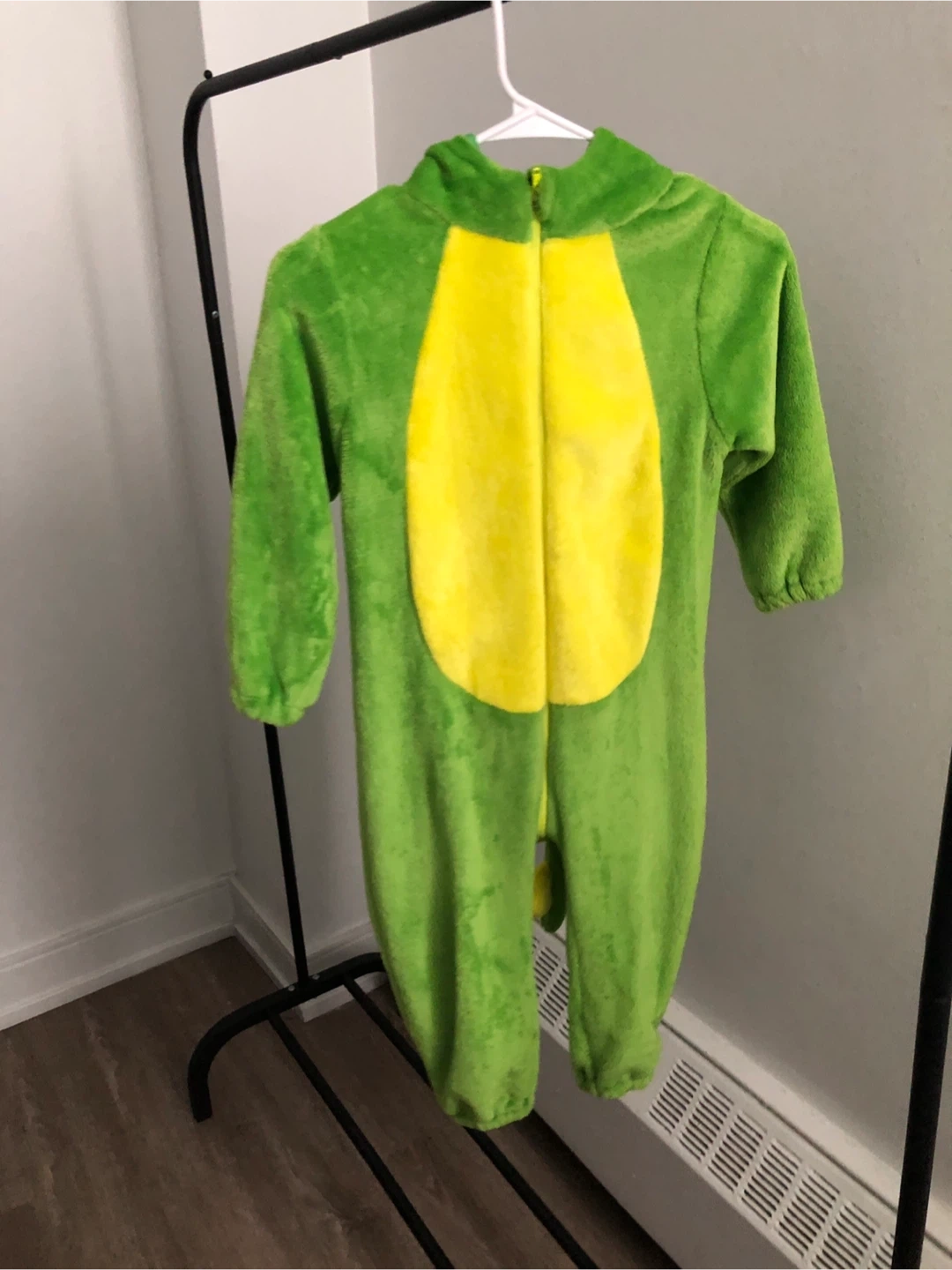 Here's a cute green dinosaur onesie costume! It's in great condition and perfect for dress-up or Halloween. The onesie is made of a soft, plush material and features yellow accents. It's a fun and comfy costume for your little one