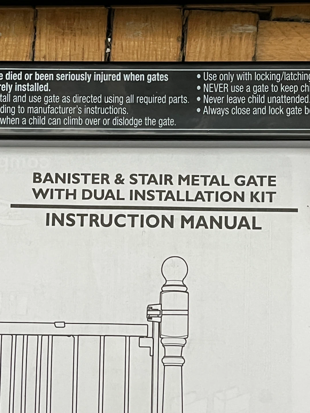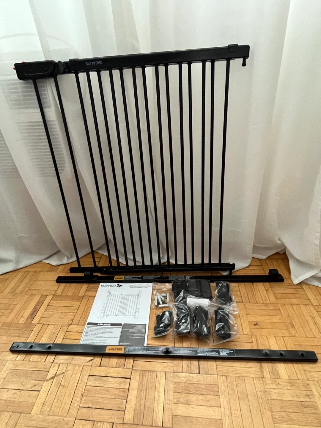 Summer brand banister and stair metal gate with a dual installation kit. It comes with all the necessary components and the instruction manual.