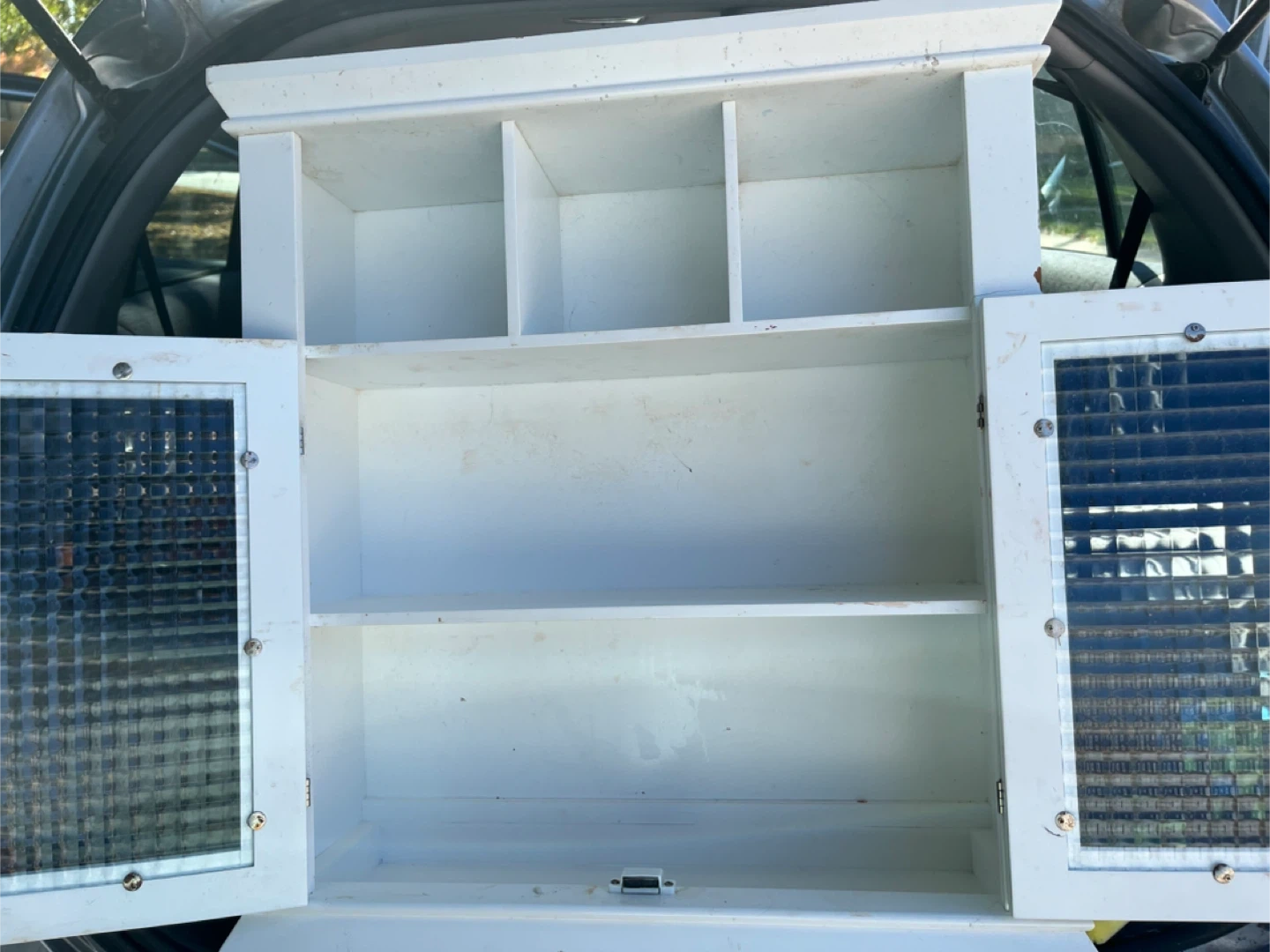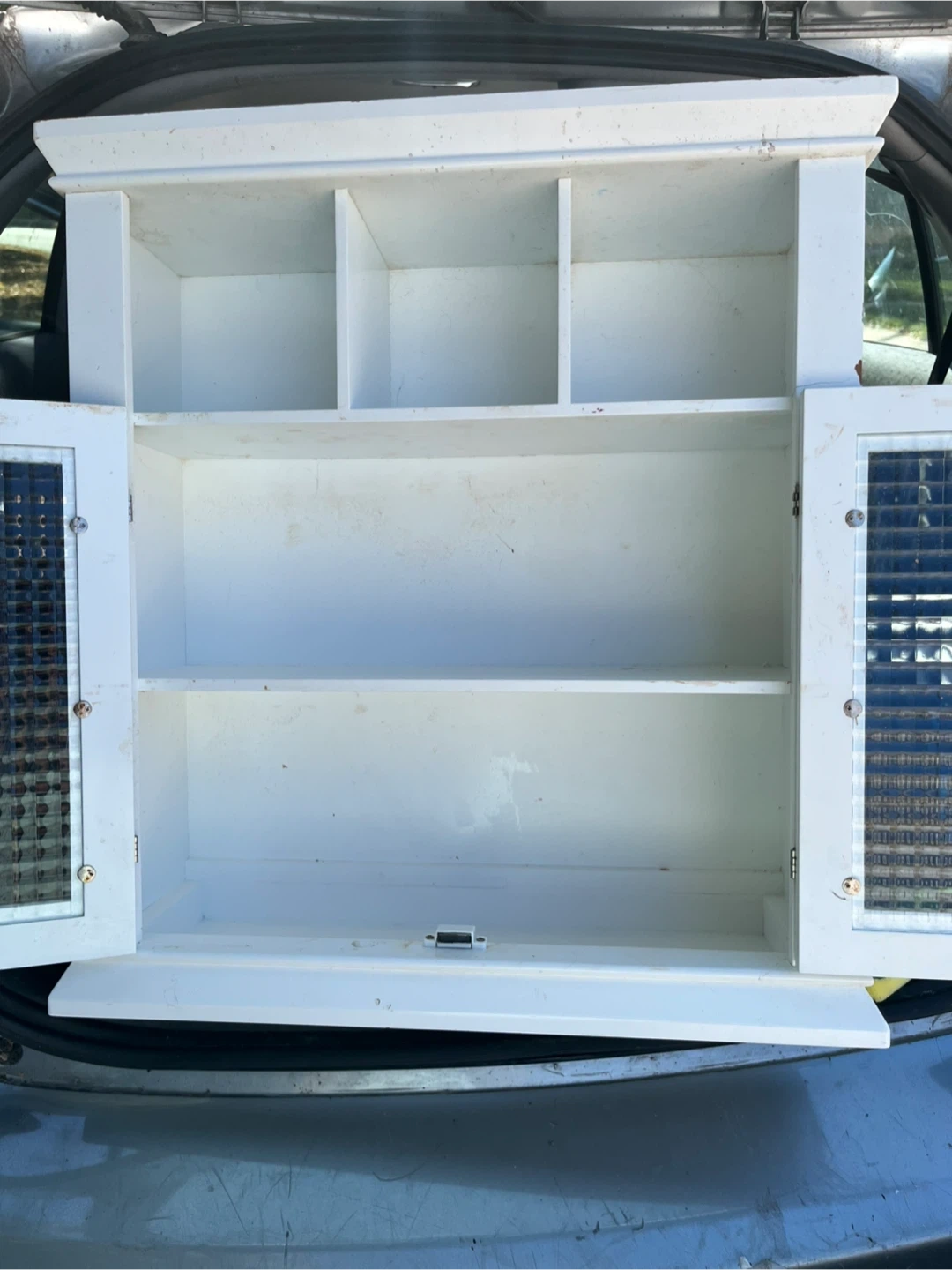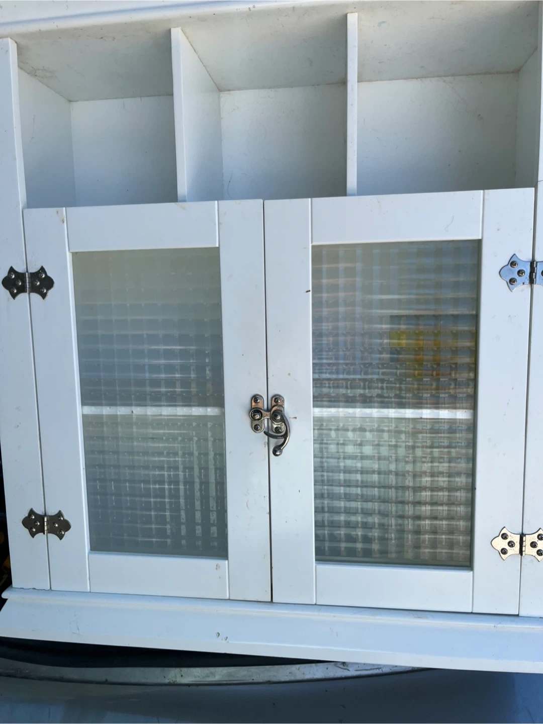 Selling a cute white bathroom cabinet! It has glass doors and some shelves for storage. It's perfect for adding a bit of extra space in your bathroom for toiletries or other items. It's in good condition and ready for a new home!