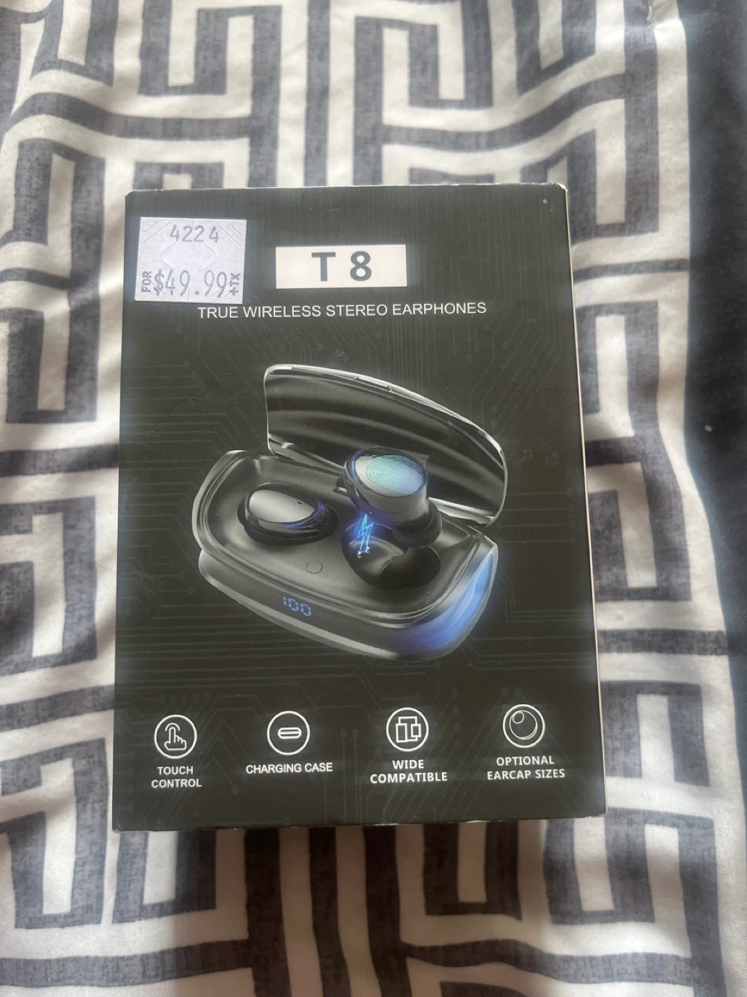 639Selling a brand new pair of T8 True Wireless Stereo Earphones! The box includes the charging case and optional earcap sizes. It features touch control and is widely compatible. Originally priced at $49.99