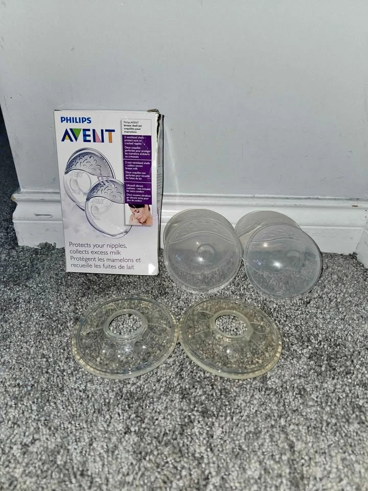 Phillips Advent nipple protector and milk catcher. Vented shields and invented shields. Total 4. Box has seen better days, but product is good. Can be sterilized. Instructions are in the box. Pick up Pitt Meadows Athletic Park or at Burnaby Hospital. Cash only