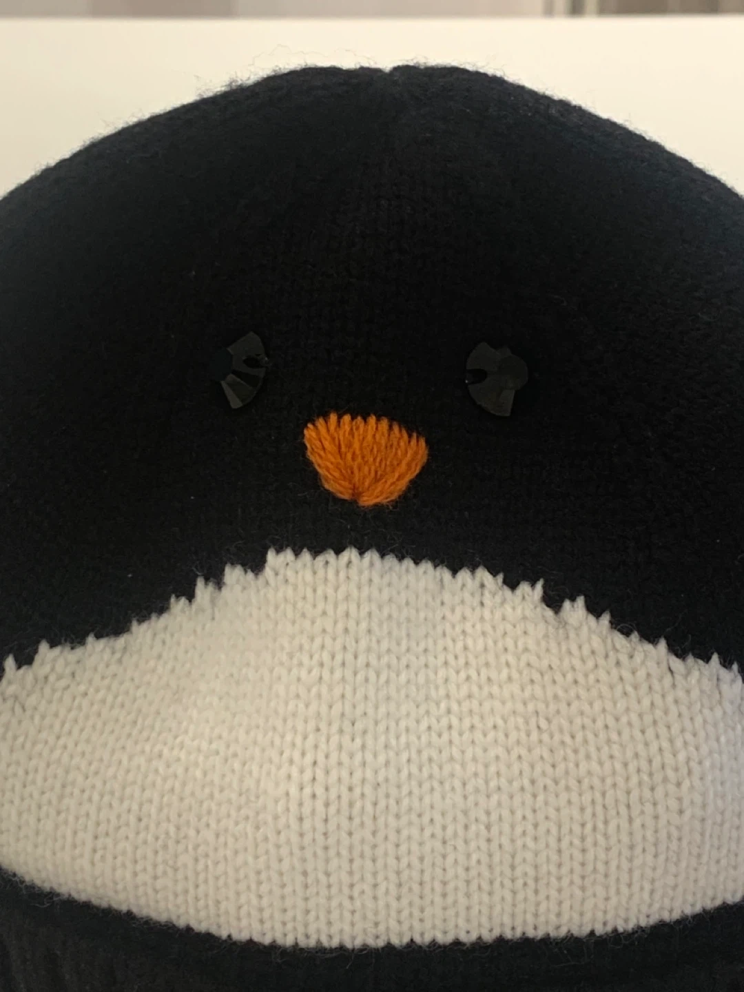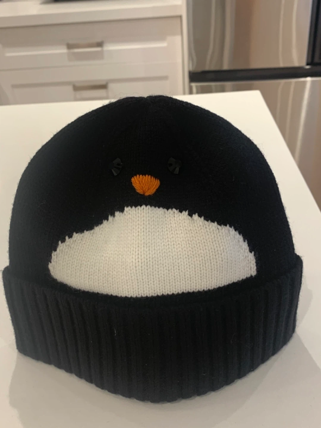 496Super cute Kate Spade beanie! It's a black knit hat with a white penguin design on the front. The material is 70% acrylic and 30% wool, so it's nice and warm for our Canadian winters. One Size, no rips, tears, or stains.