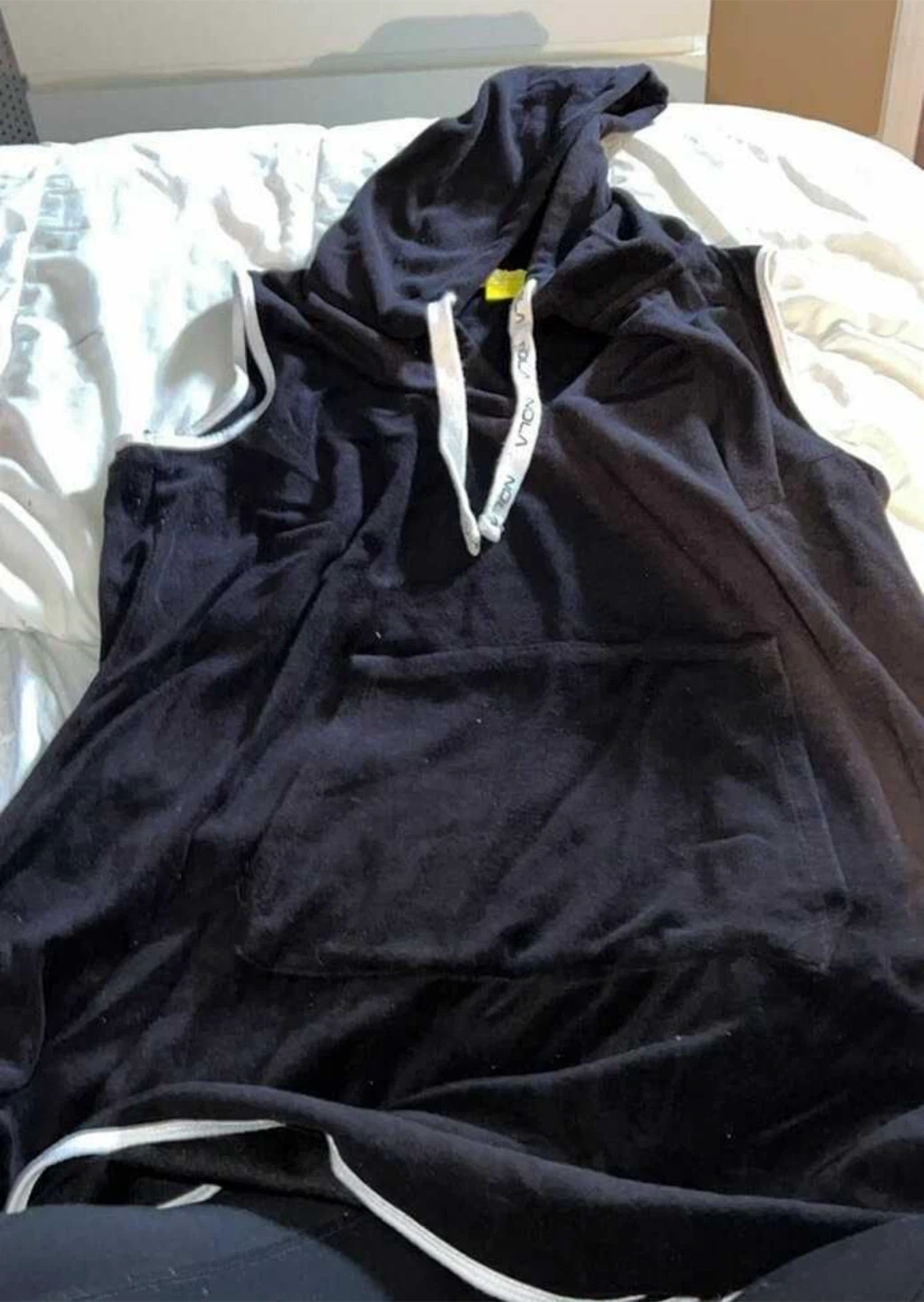 Selling a Nola black sleeveless swimsuit cover up. It has a front pocket and white drawstrings. The trim is also white. Perfect for going to the beach.