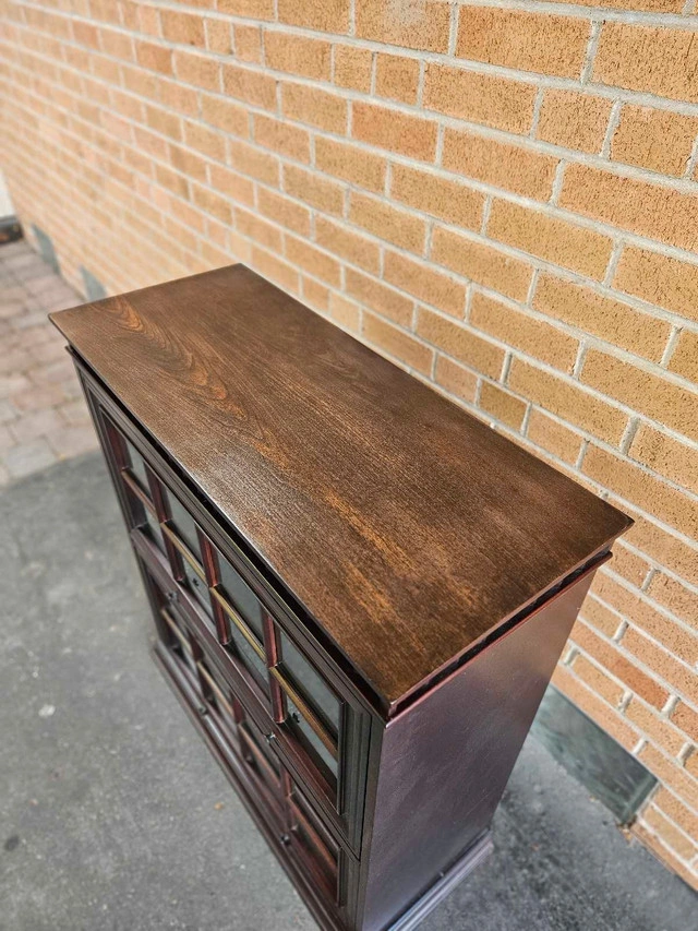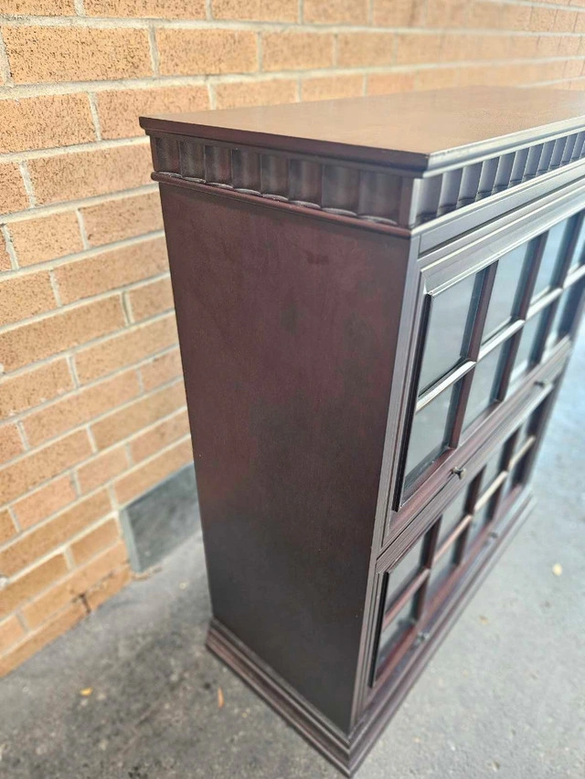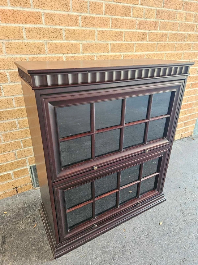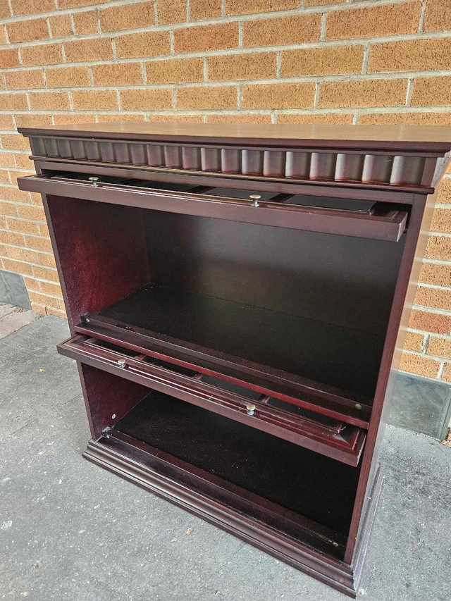 Beautiful mahogany barrister bookcase by Bombay and Co. Two tall shelves for plenty of books. Smooth sliding covers with magnetic door catch. Top has some wear but overall excellent condition. Dimensions: 31" W x 13" D x 36" H Pick up near Don Mills and Sheppard.