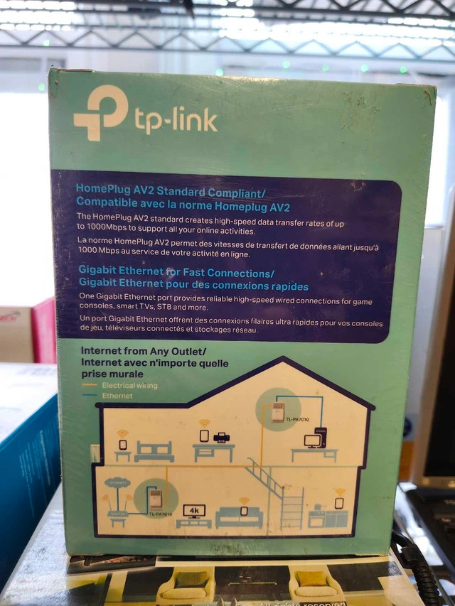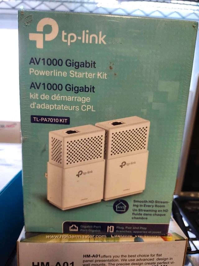 Get seamless and fast internet connectivity throughout your home with this new TP-Link AV1000 Gigabit Powerline Starter Kit, TL-PA7010 KIT. This kit leverages your home's existing electrical wiring to create a robust and reliable network, perfect for streaming, gaming, and connecting all your devices. Key features include: * AV1000 Powerline Adapter * Gigabit Ethernet Port * HomePlug AV2 Standard Compliant * Easy Plug, Pair and Play Setup. We have 4 available.