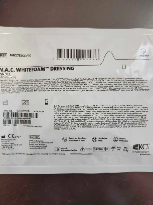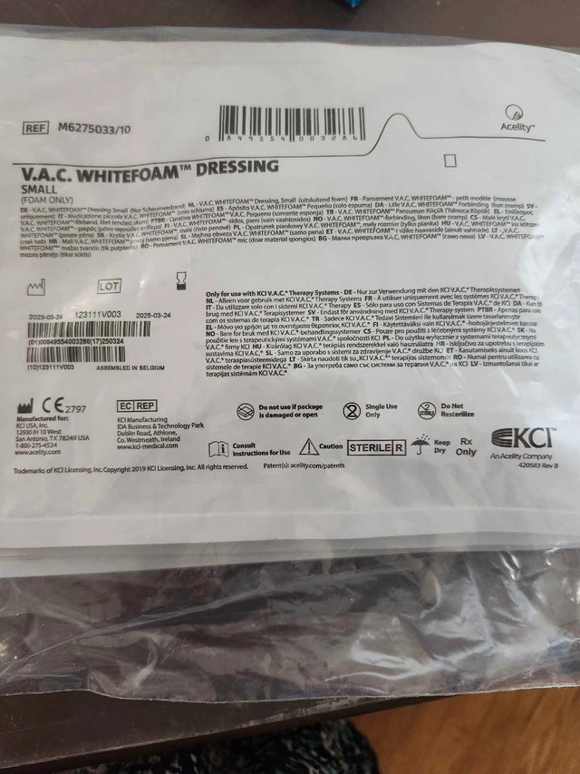 I am offering a V.A.C. WhiteFoam Dressing, small size, designed for V.A.C. Therapy Systems, perfect for advanced wound care. This dressing is sterile and comes in its original, unopened packaging, ensuring the highest standards of hygiene and effectiveness. If the ad's still up, yes, it's still available!