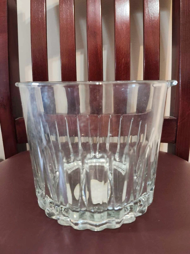 Add a touch of elegance to your bar or dining area with this stylish clear glass ice bucket featuring a unique vertical pattern. This bucket is in good condition and ready to keep your drinks cool. It is nice and sturdy, so it will probably last a long time. This could also make a nice decorative piece to hold candies or flowers in if you're entertaining! The possibilities are endless!