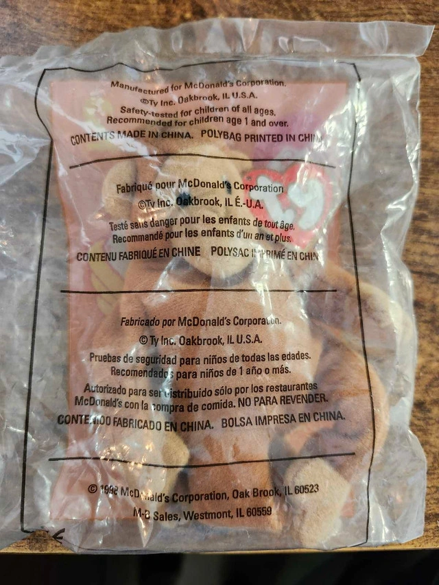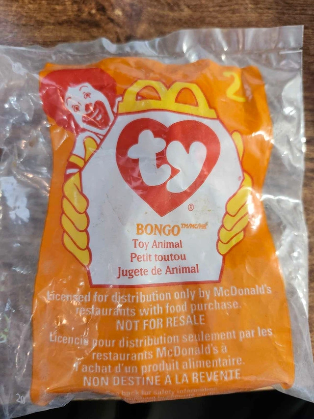 This is a brand new 1998 McDonalds Teenie Beanie Bongo the Bear toy, still sealed in its original packaging. It's a delightful piece of nostalgia, perfect for collectors and enthusiasts of vintage McDonald's memorabilia. This Teenie Beanie is in pristine condition, never opened, and ready to find a new home. Here are some details about the item: