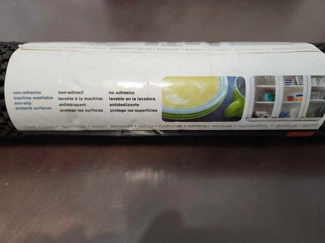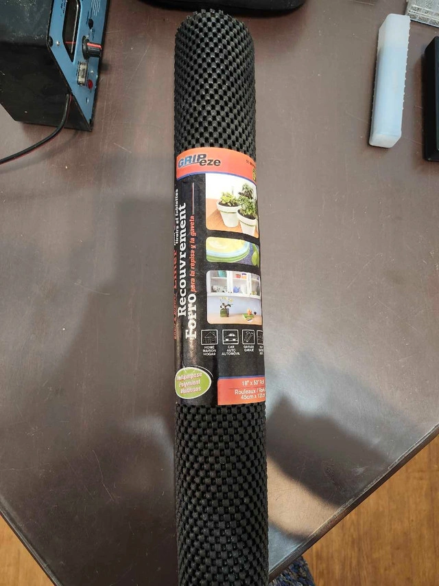 I'm selling a roll of Grip Eze shelf liner, perfect for keeping items in place in your cabinets, drawers, or on shelves. This liner is non-adhesive, machine washable, and non-slip, providing excellent protection for surfaces. It measures 18 inches by 50 inches, or 45cm x 125cm. This roll is new in the package. Specifications: