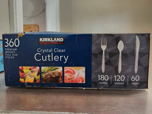 This is a box of Kirkland Signature Crystal Clear Cutlery, containing 360 pieces: 180 forks, 120 spoons, and 60 knives. The box has some wear and tear, but the cutlery inside is in good condition and ready for your next gathering! I'm pricing this at $20.