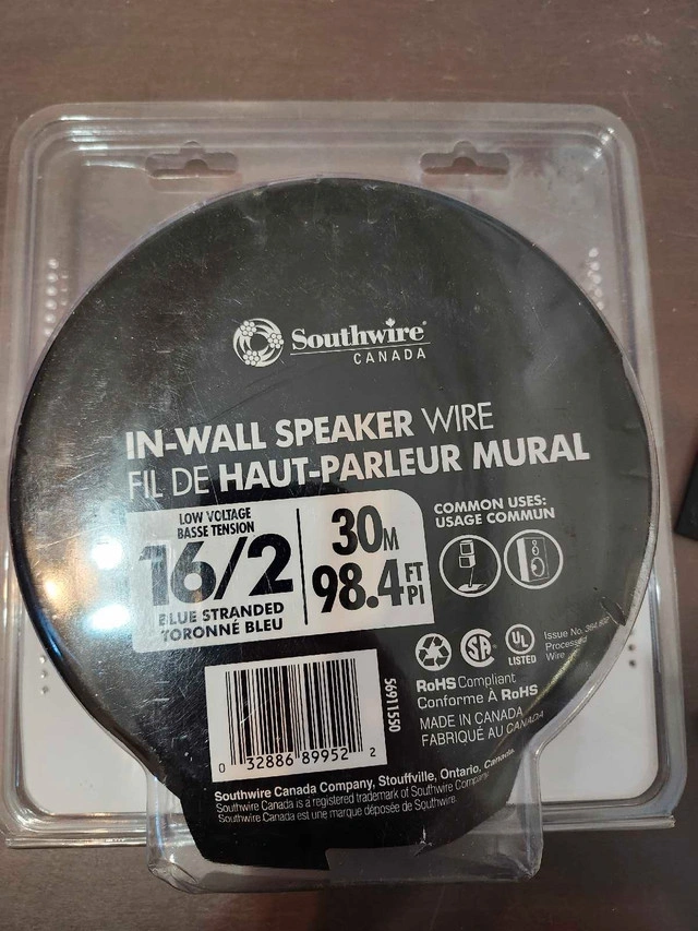 Enhance your audio setup with this 30-meter spool of Southwire 16/2 blue stranded in-wall speaker wire, perfect for creating a seamless home theatre or sound system. This is new old stock, never opened and ready to go. Type: In-Wall Speaker Wire. Length: 30 meters (98.4 ft). Gauge: 16/2. Stranding: Blue Stranded. Condition: New. If the ad is still up, then yes, it's available!