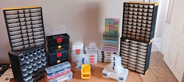 I'm offering a variety of used storage containers, perfect for organizing everything from small parts to craft supplies. These containers come in various sizes and configurations, including multi-compartment boxes and stackable units, great for anyone looking to get their space in order.