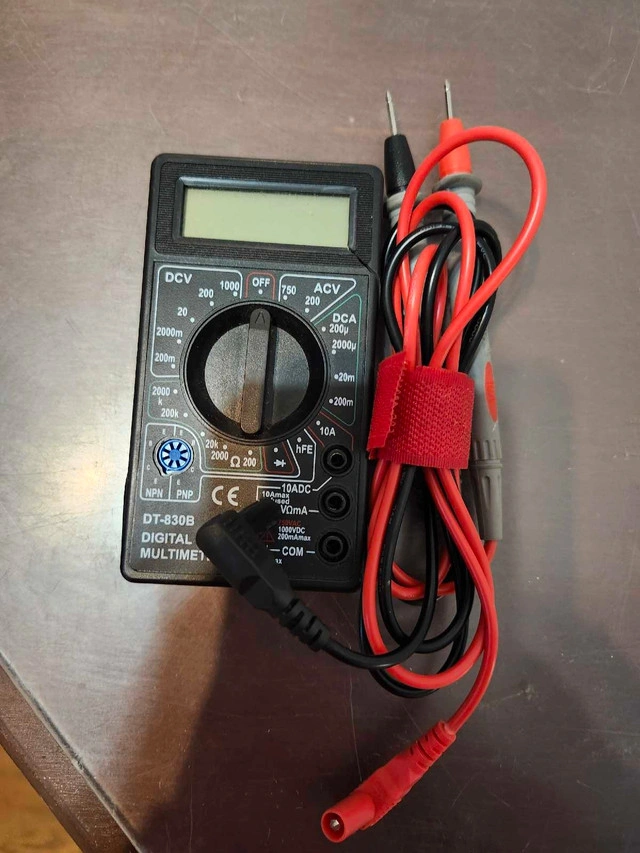 This DT-830B digital multimeter is a handy tool for basic electrical testing, though it shows signs of use. It's been tested and is still functional, allowing you to measure voltage, current, and resistance, but note the small crack on the side (see photos). I estimate its value around $10 CAD, considering similar multimeters available on Kijiji.