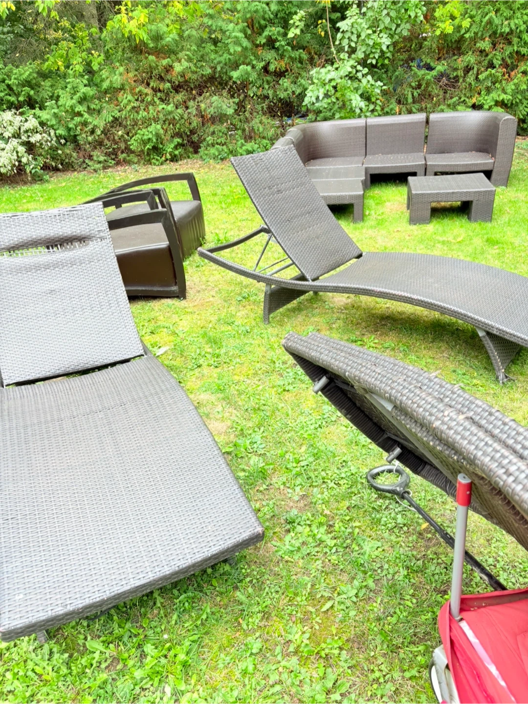 Outdoor wicker lounge set in brown. Includes a sectional sofa, coffee table, and lounge chair. Perfect for enjoying the summer weather in your backyard