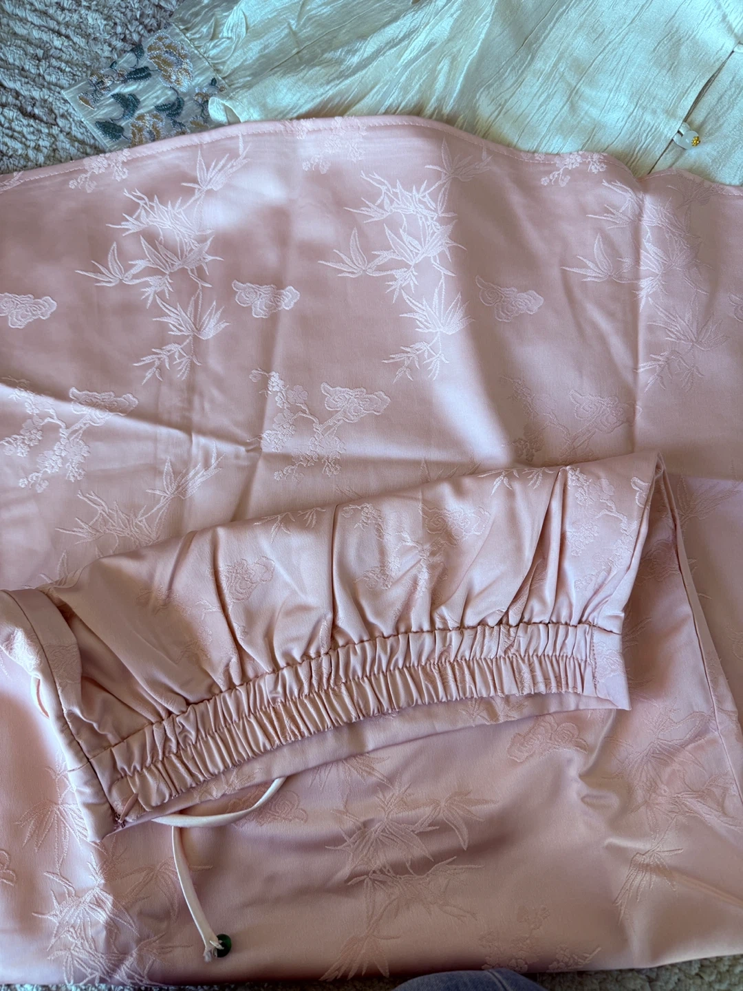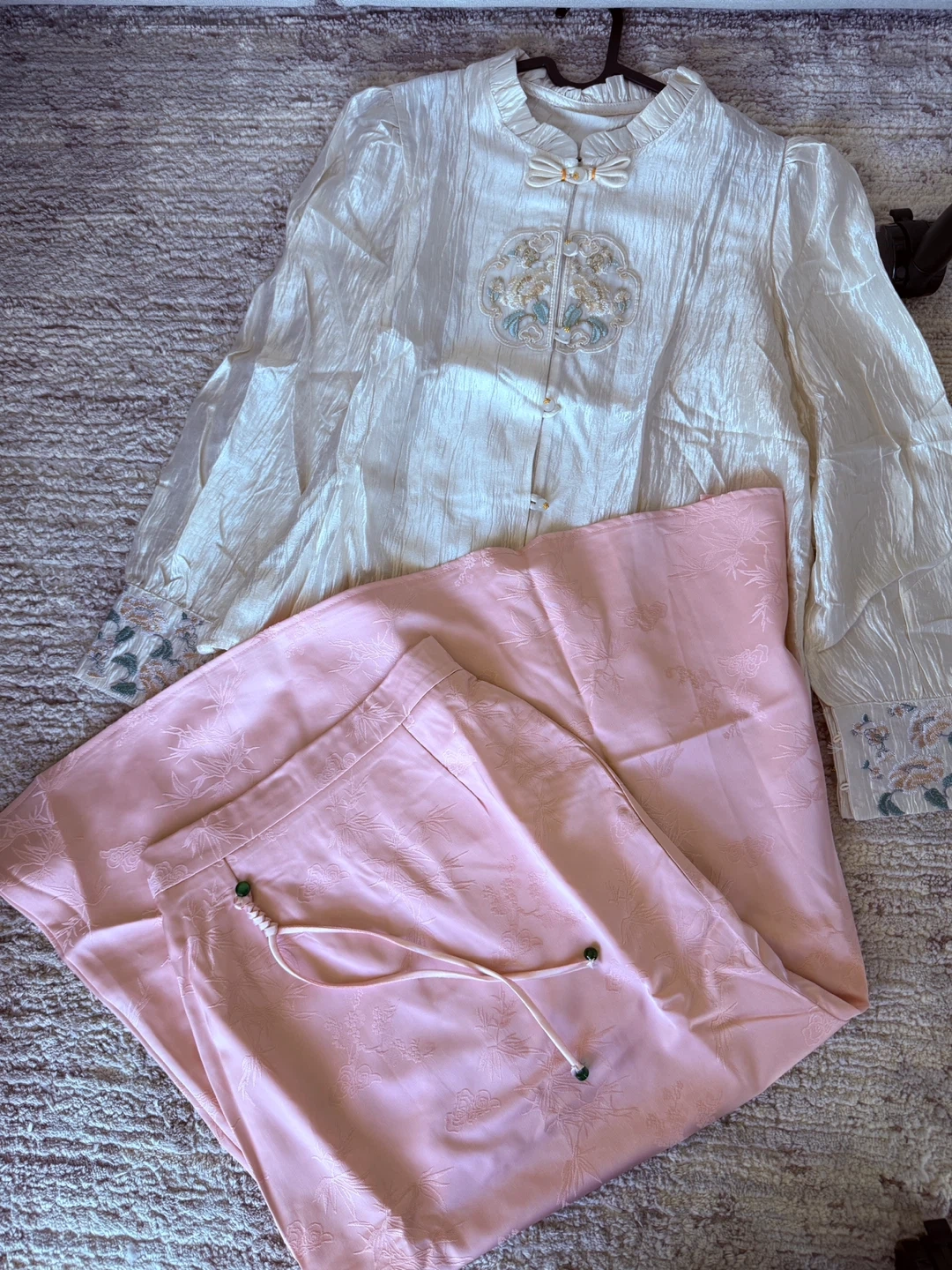 This is a beautiful outfit featuring delicate floral embroidery. The top has a unique mandarin collar and intricate detailing around the closure. The bottoms are a matching pink with a subtle pattern and comfortable elastic waistband. Perfect for a special occasion or adding a touch of elegance to your wardrobe! Max wasit for the Skirt is 85cm