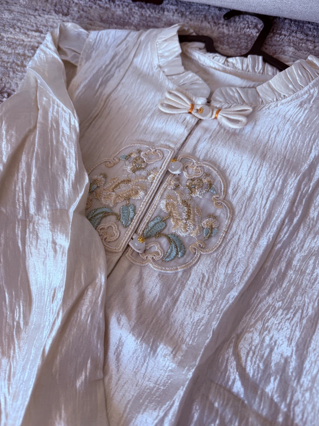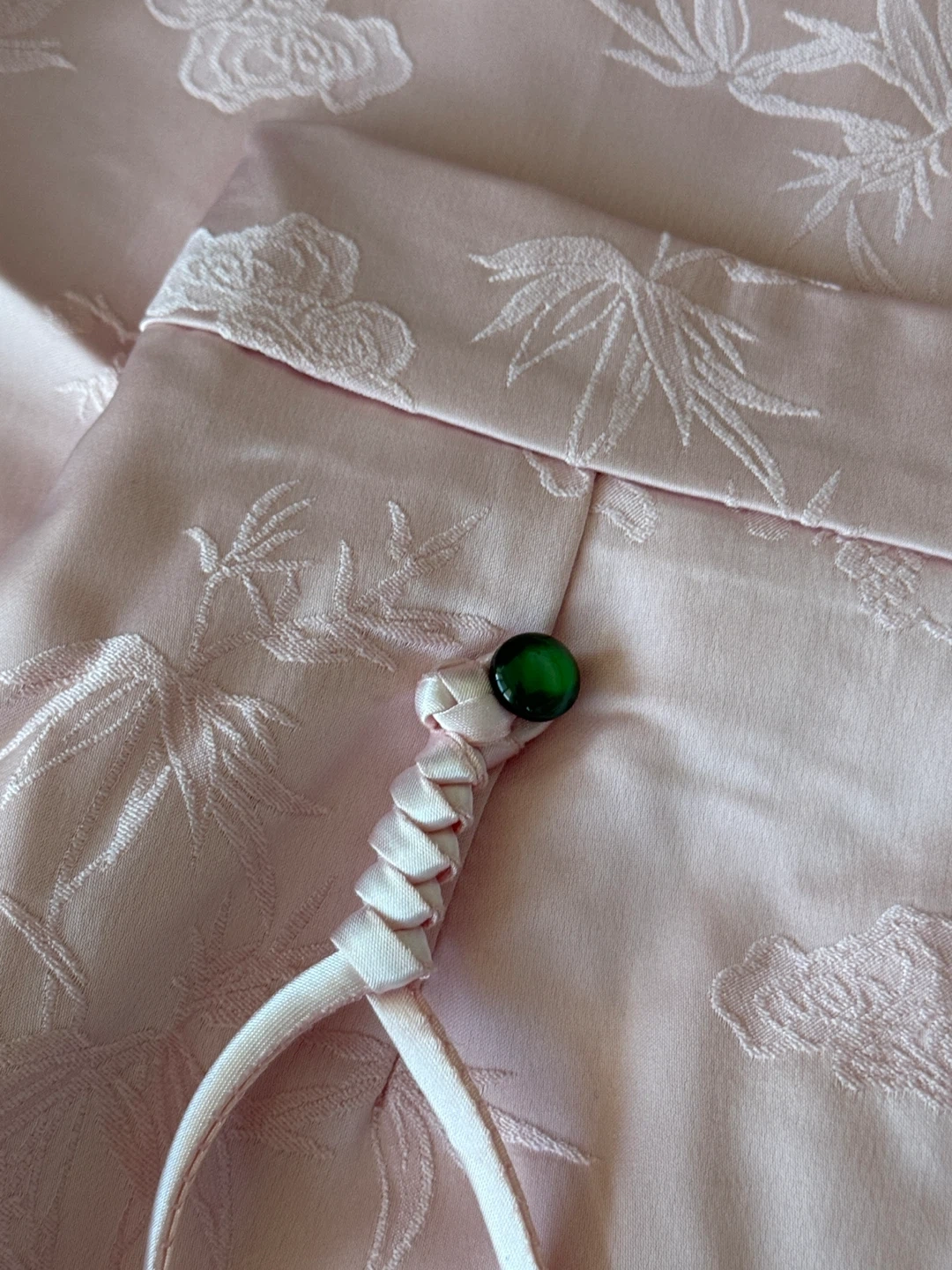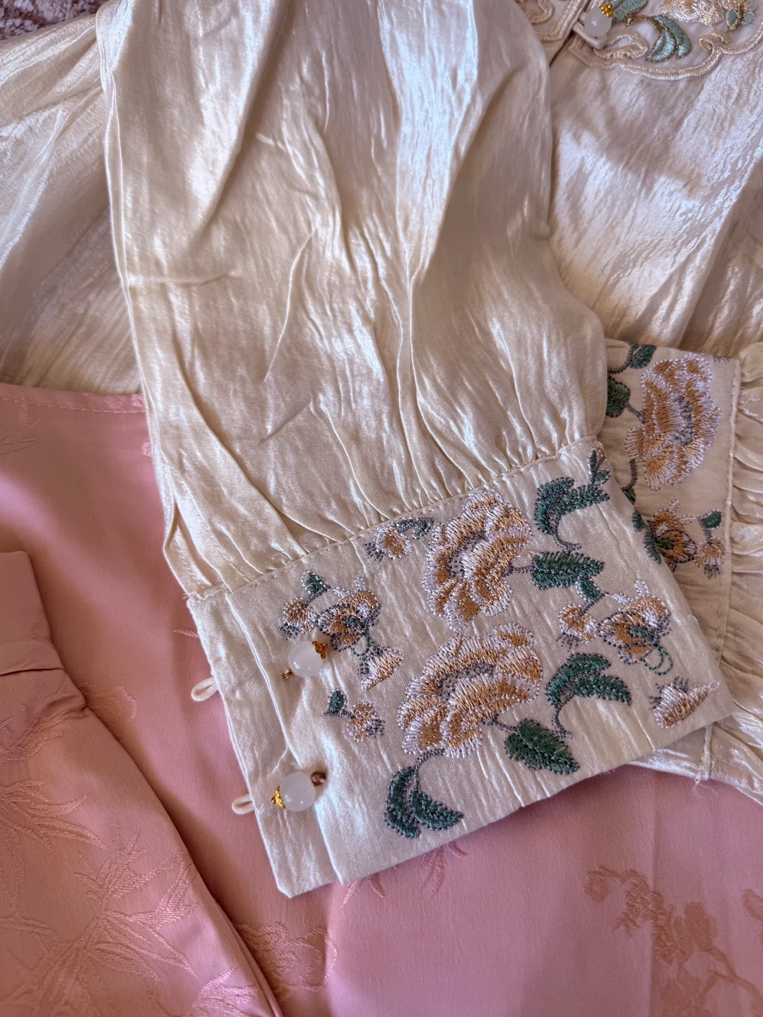 This is a beautiful outfit featuring delicate floral embroidery. The top has a unique mandarin collar and intricate detailing around the closure. The bottoms are a matching pink with a subtle pattern and comfortable elastic waistband. Perfect for a special occasion or adding a touch of elegance to your wardrobe! Max wasit for the Skirt is 85cm