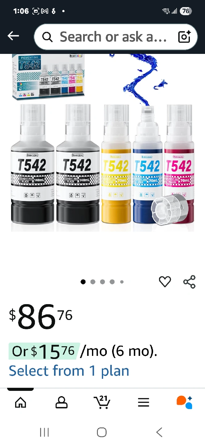 Selling a set of Inkgens T542 ink refill bottles. These are designed for use with Epson Ecotank printers, including models like the ET-16600, ET-5850, and several WorkForce ST series printers. The set includes black, cyan, magenta, and yellow inks. Originally bought for $86.76