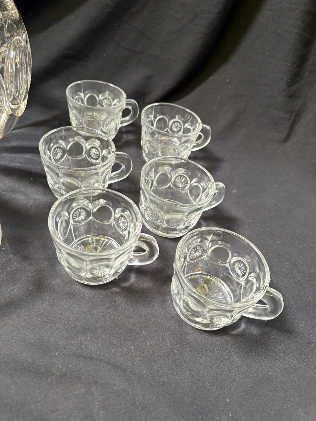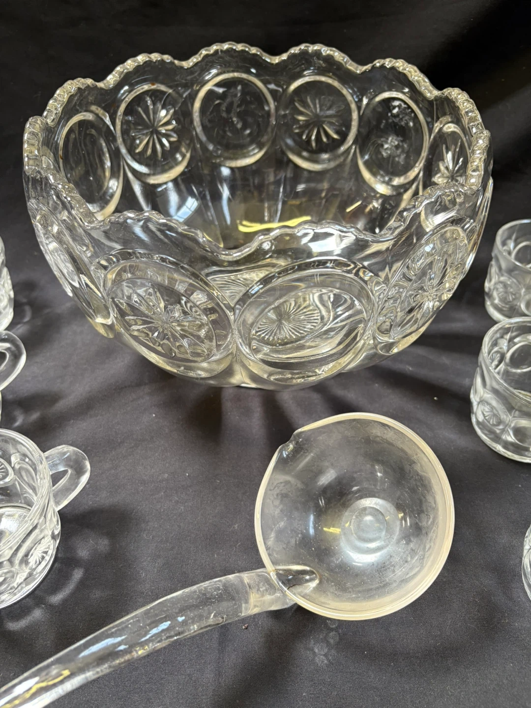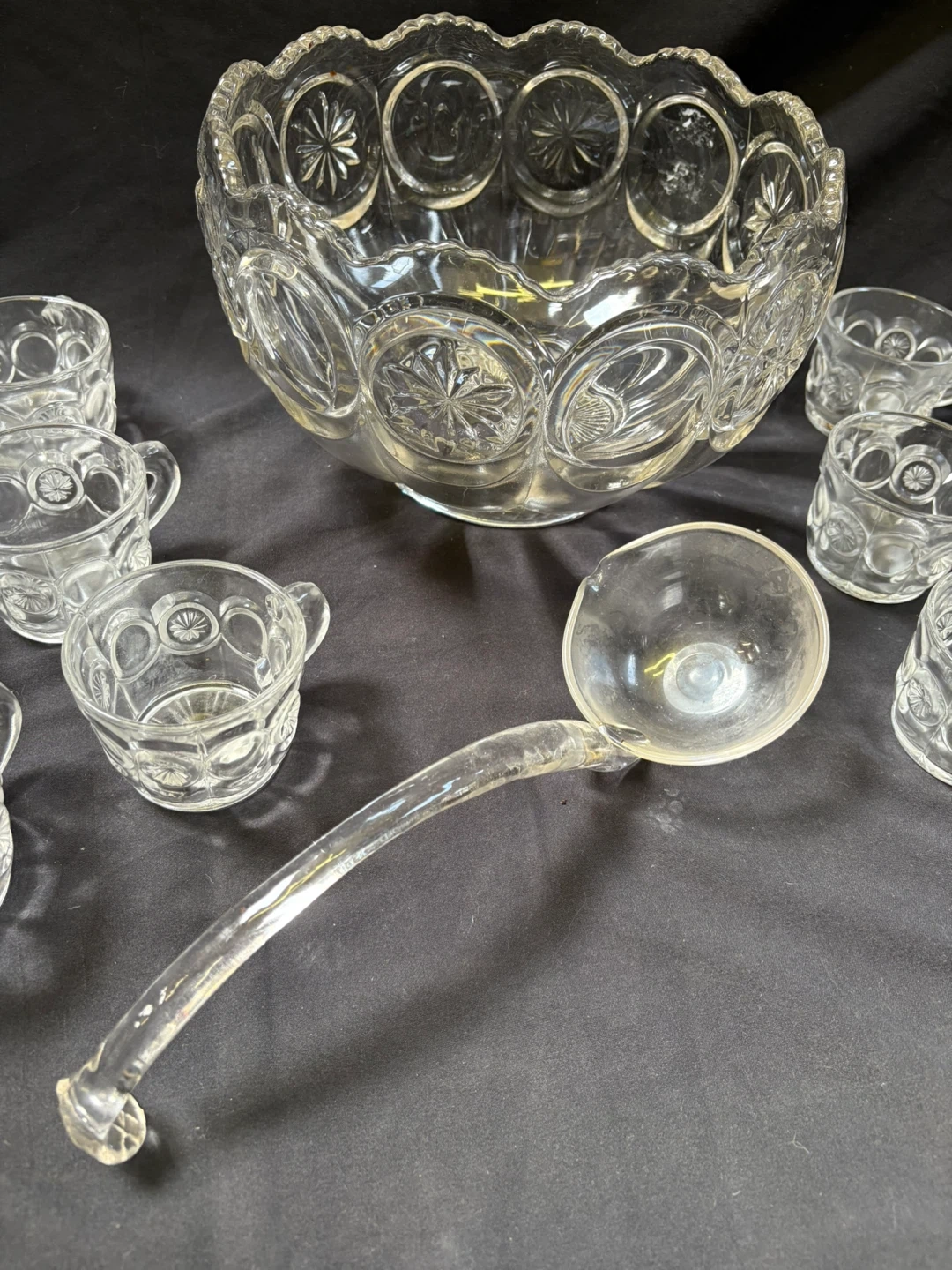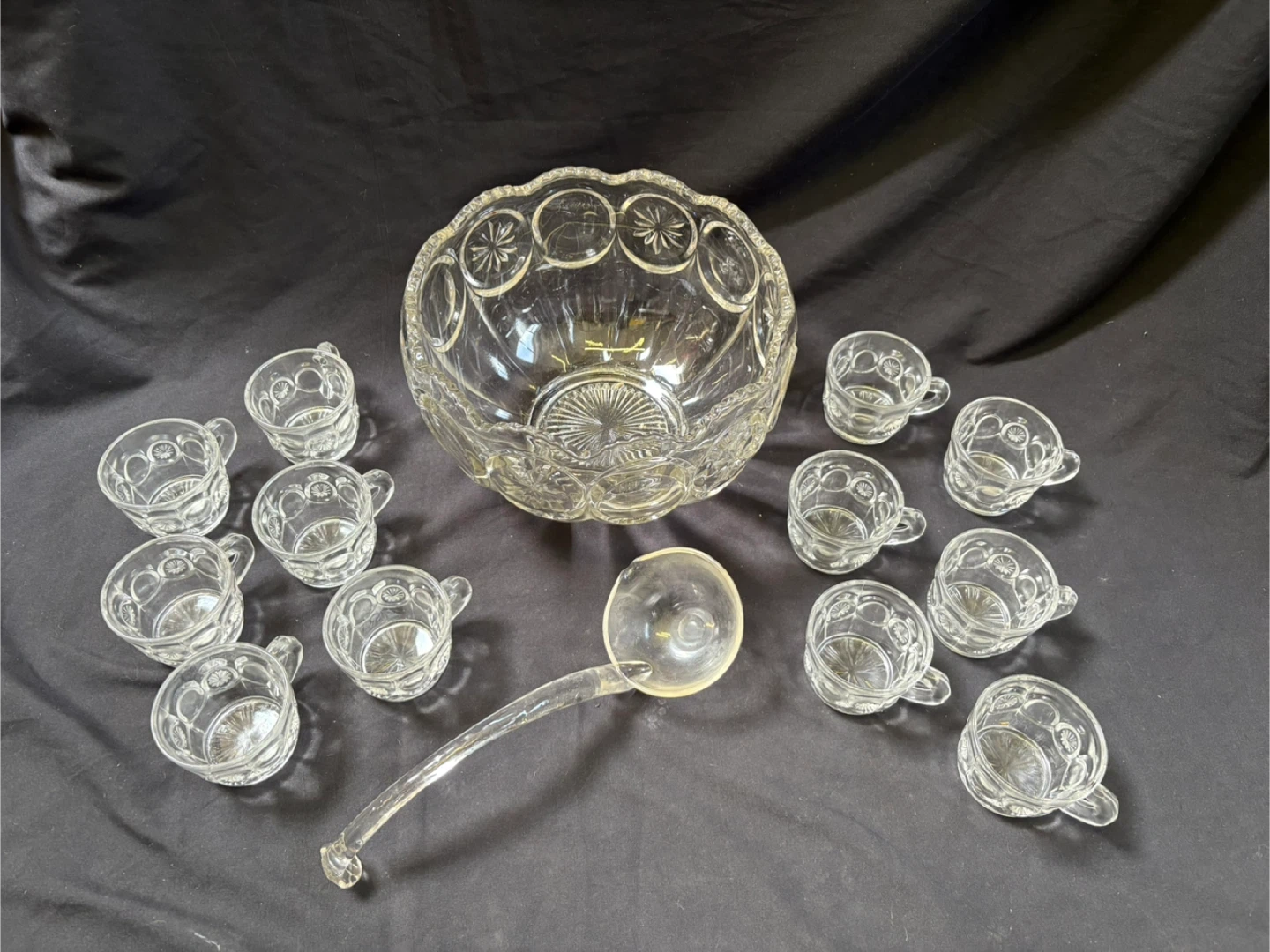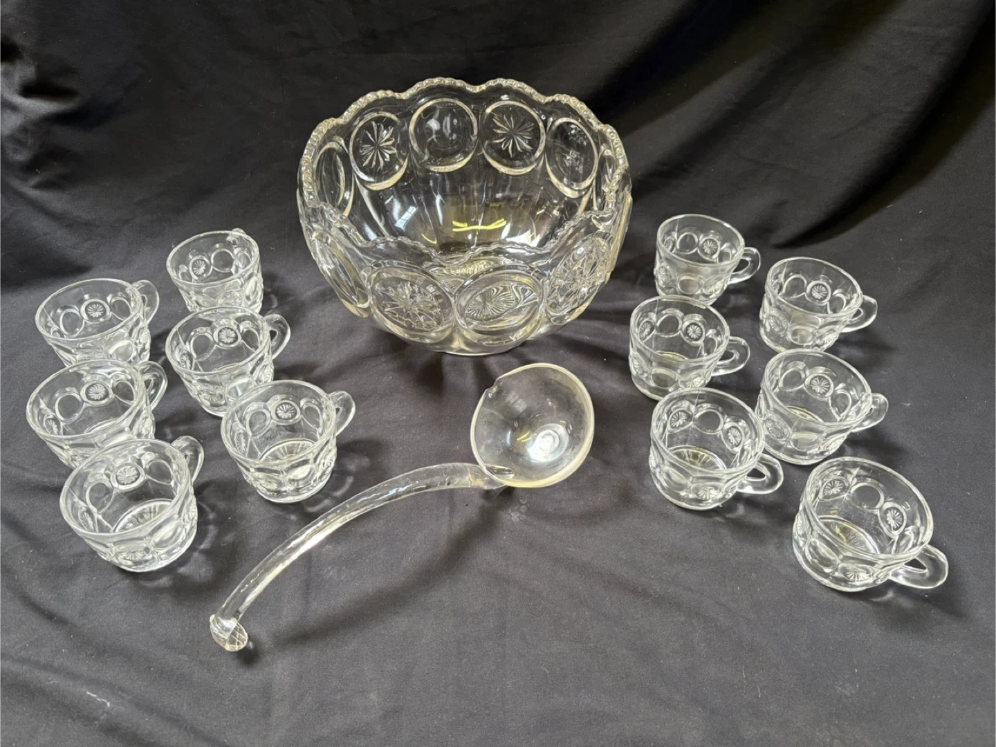 good condition Vintage Punch Bowl Set with Cups and Ladle Selling a beautiful vintage punch bowl set! It includes the punch bowl, 12 cups, and a ladle. The set is made of clear glass with a lovely starburst pattern. Perfect for parties and gatherings! Measurements in last couple of pics $20 Pick up Victoria Park & O’Connor area