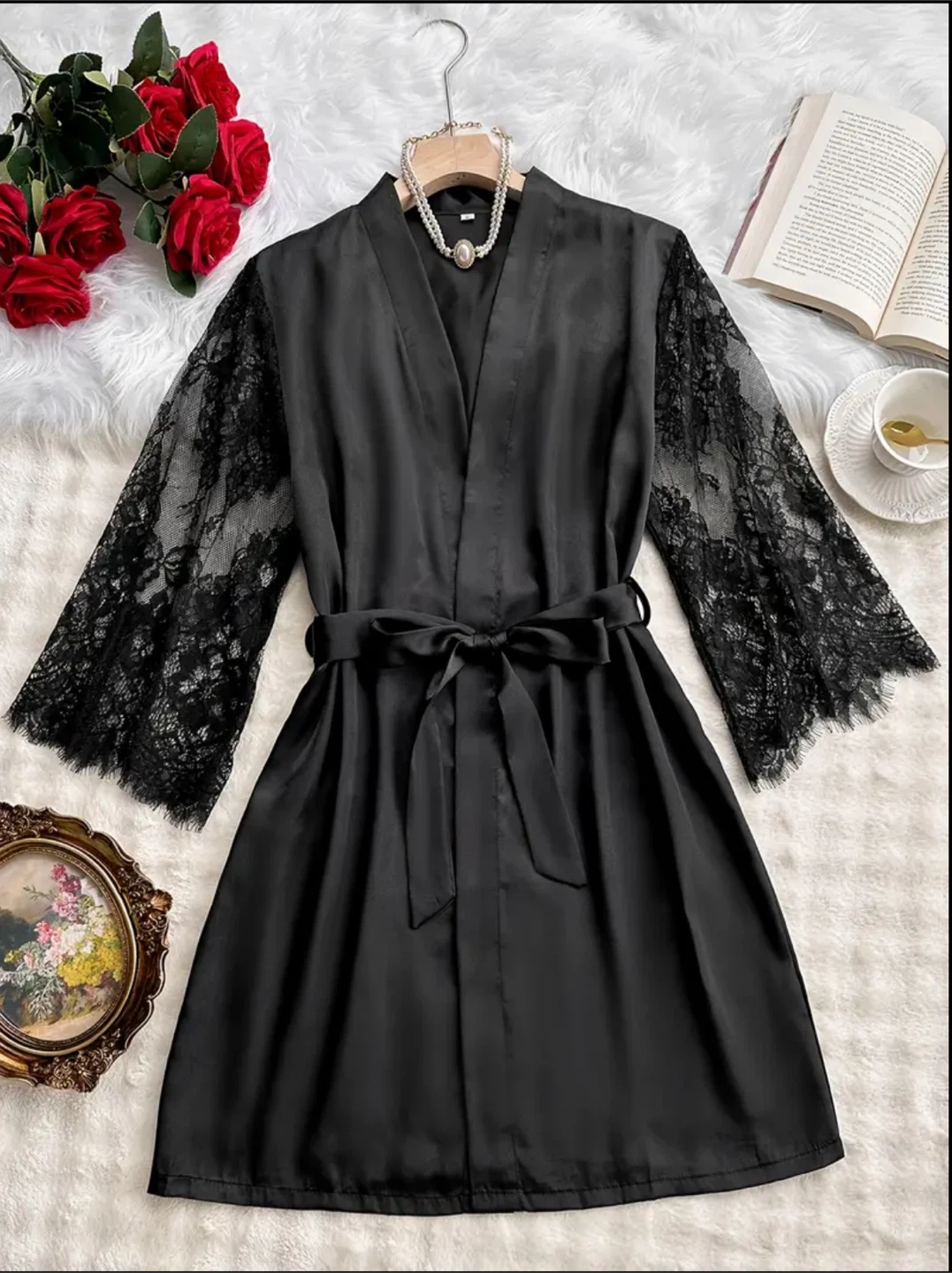 Selling a beautiful black robe with lace sleeves. It's in great condition and would be a lovely addition to your wardrobe! The robe features delicate lace detailing on the sleeves and a tie at the waist. Size XL. 🥕